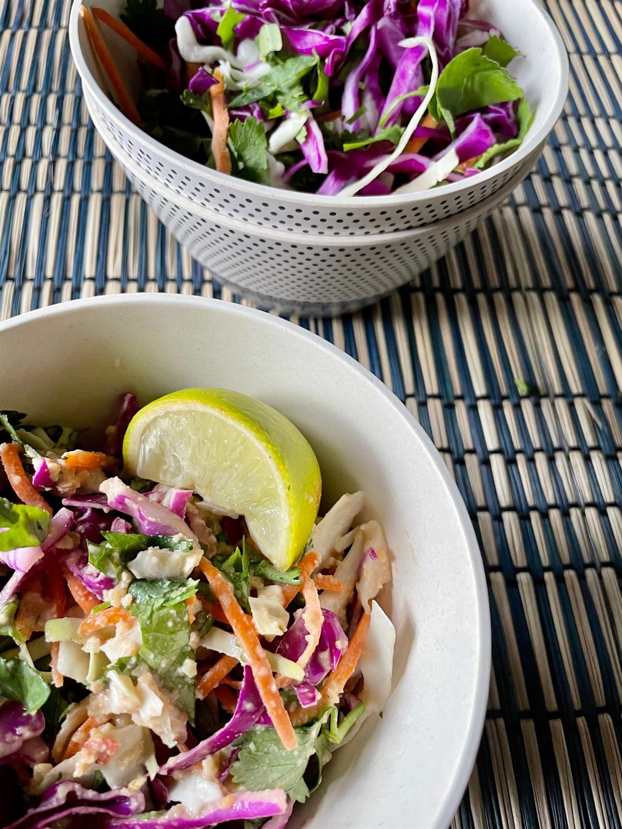 Τρίβουμε 2 καρότα στον χοντρό τρίφτη και ψιλοκόβουμε ½ μικρό λευκό λάχανο και ½ μικρό κόκκινο λάχανο. Ψιλοκόβουμε επίσης και 1 μάτσο φρέσκο κόλιανδρο. Τα βάζουμε σε βαθύ μπολ, τα αλατίζουμε ελαφρά, προσθέτουμε λίγο έξτρα παρθένο ελαιόλαδο και τον χυμό από 2 μοσχολέμονα (lime). Τα αφήνουμε λίγη ώρα για να μαραθούν ελαφρώς.