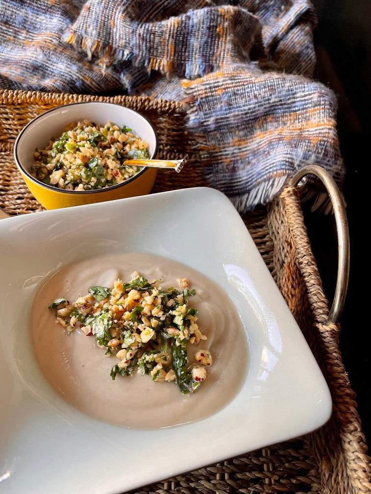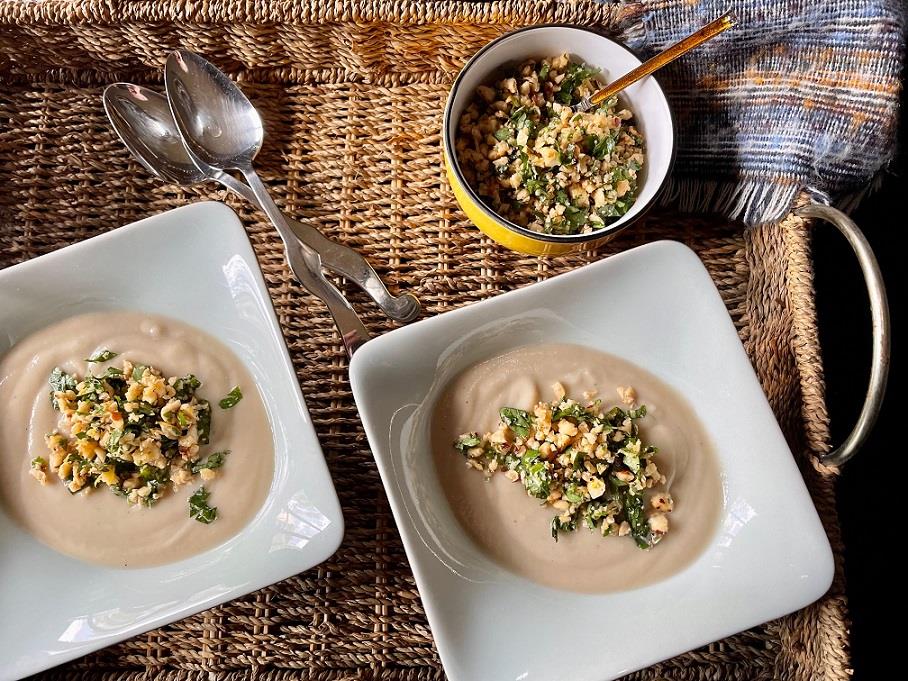 Κόβουμε 1 μέτρια σελινόριζα σε κύβους, ½ κουνουπίδι σε μπουκέτα και 2 μέτριες μαραθόριζες (φινόκιο) σε κύβους. Ψιλοκόβουμε 1 μεγάλο ξερό κρεμμύδι και 1 σκ. σκόρδου. Σε μία μεγάλη κατσαρόλα βάζουμε ελαιόλαδο ίσα να σκεπάζει τον πάτο, προσθέτουμε τα λαχανικά, αλατοπιπερώνουμε και πασπαλίζουμε με 1 γεμάτη κ.γλ. μαραθόσπορους και ½ κ.γλ. κύμινο. Σοτάρουμε τα λαχανικά σε μέτρια προς δυνατή φωτιά ανακατεύοντας, μέχρι να πάρουν ελαφρύ χρώμα. Σκεπάζουμε με ζωμό λαχανικών (αν δεν έχουμε σπιτικό βάζουμε σκέτο νερό), φέρνουμε σε βρασμό, χαμηλώνουμε την φωτιά σε μέτρια, μισοσκεπάζουμε την κατσαρόλα και βράζουμε μέχρι να μαλακώσουν εντελώς τα λαχανικά. Πολτοποιούμε σε λεία βελουτέ, δοκιμάζουμε και διορθώνουμε τη γεύση.