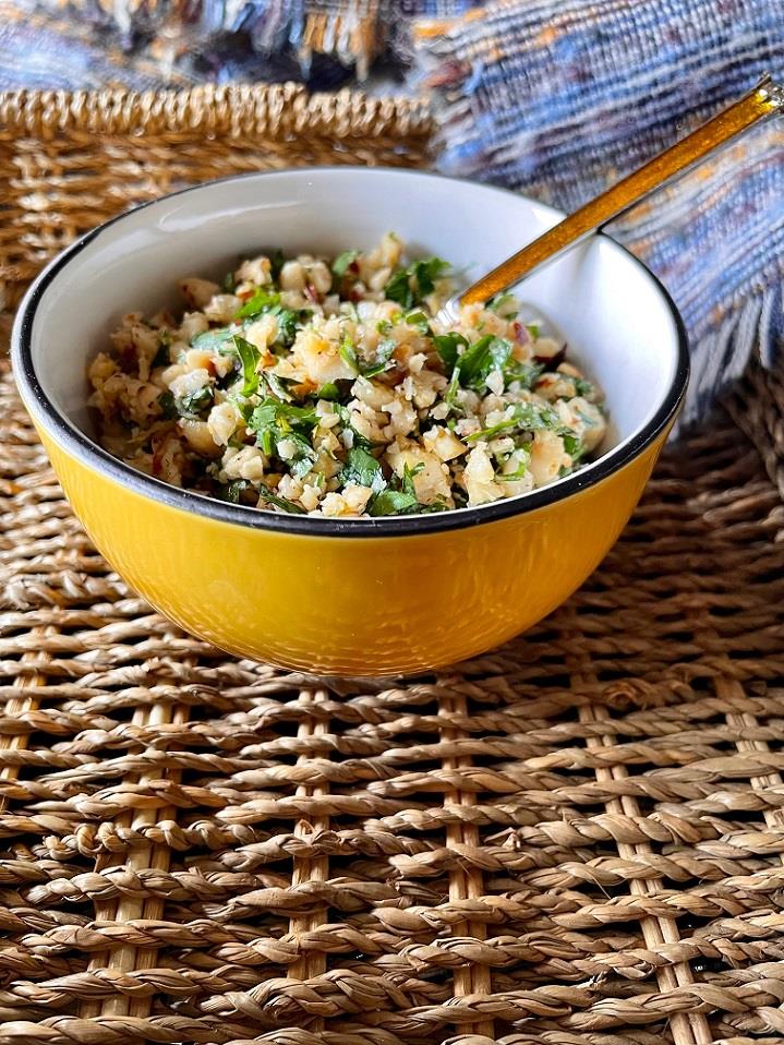 Καβουρδίζουμε ελαφρά 1 μεγάλη χούφτα φουντούκια σε μέτρια προς δυνατή φωτιά μέχρι να πάρουν ελαφρύ χρώμα και να βγάλουν το άρωμά τους. Τα αφήνουμε να κρυώσουν και τα ψιλοκόβουμε με μεγάλο μαχαίρι του σεφ. Τα ανακατεύουμε με μπόλικο ψιλοκομμένο μαϊντανό, αλάτι και πιπέρι, προαιρετικά λίγο πιπέρι καγιέν και το ξύσμα από 1 λεμόνι.