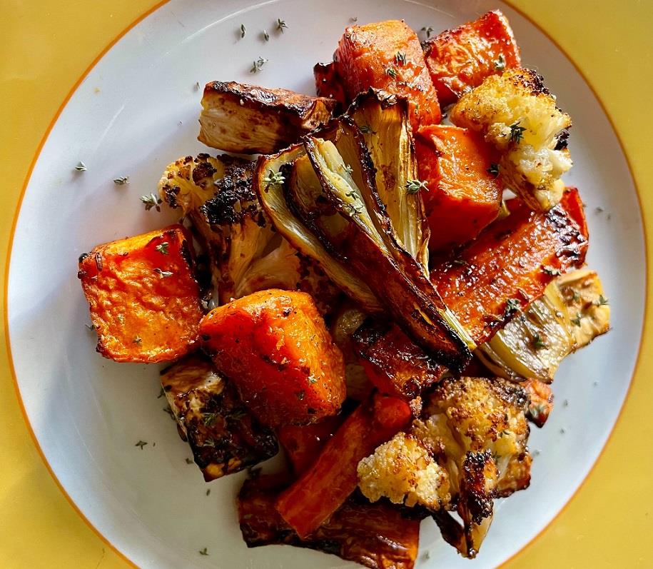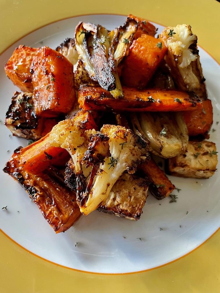 Διαλέγουμε τα λαχανικά που μας αρέσουν και τα κόβουμε σε κομμάτια. Εγώ έβαλα σελινόριζα, γλυκοπατάτες, κουνουπίδι, μαραθόριζες και καρότα. Τα αραδιάζουμε στη λαμαρίνα του φούρνου που έχουμε στρώσει με λαδόκολλα, τα αλατοπιπερώνουμε, σκορπάμε ανάμεσα και λίγο φρέσκο ή ξερό θυμάρι (ταιριάζει και το δενδρολίβανο), τα πασπαλίζουμε με μπαχαρικά σε σκόνη (έβαλα κύμινο, κόλιαντρο και ginger), τα ραντίζουμε με λίγο ελαιόλαδο και λίγο βαλσαμικό ξύδι και τα ανακατεύουμε καλά. Ψήνουμε σε προθερμασμένο φούρνο στους 190-200ο C στη λειτουργία του αέρα για περίπου 30΄, μέχρι να μαλακώσουν, να πάρουν έντονο χρώμα και να καραμελώσουν. Απολαμβάνουμε τα λαχανικά χλιαρά. Η σαλάτα συνοδεύει άριστα όλες τις ψητές πρωτεΐνες : κρέας, πουλερικά, ψάρια. Μπορεί όμως να γίνει και ολοκληρωμένο γεύμα με την προσθήκη τριμμένης φέτας, κατσικίσιου τυριού ή γιαουρτιού.