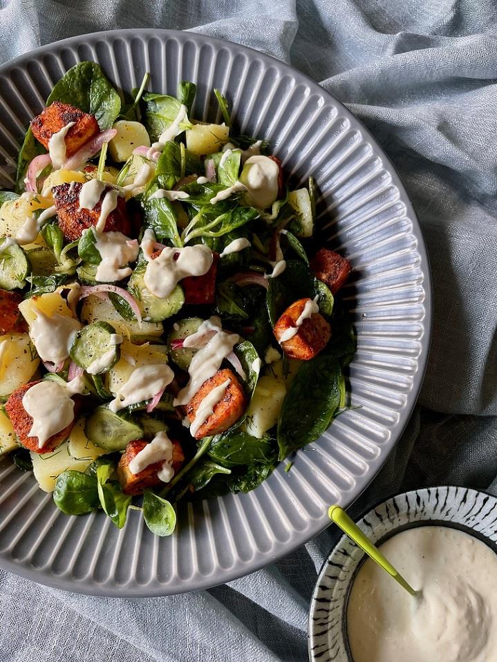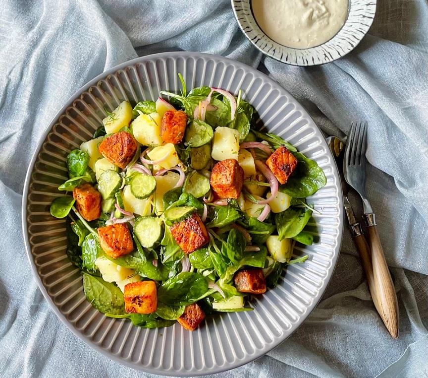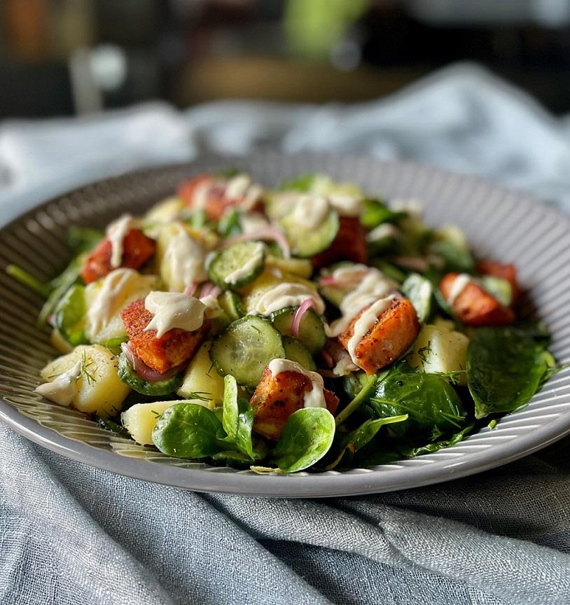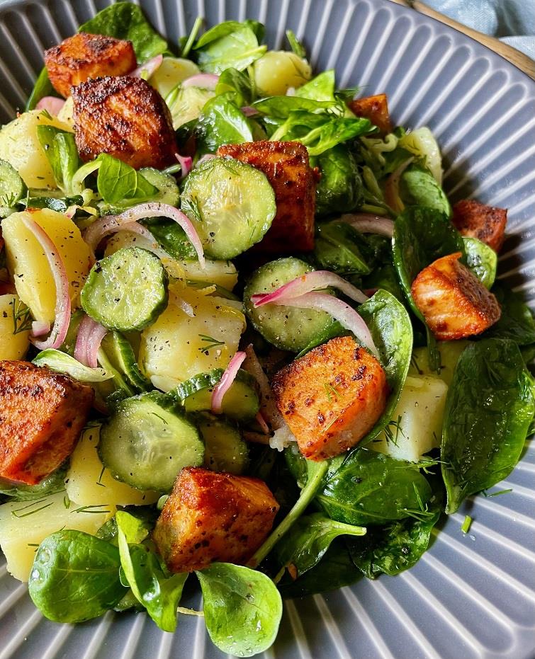 ΣΑΛΑΤΑ ΜΕ ΨΗΤΟ ΣΟΛΟΜΟ, ΠΑΤΑΤΕΣ, ΓΡΗΓΟΡΕΣ ΠΙΚΛΕΣ ΚΡΕΜΜΥΔΙΟΥ ΚΑΙ ΑΓΓΟΥΡΙΟΥ & ΠΙΚΑΝΤΙΚΟ DRESSING