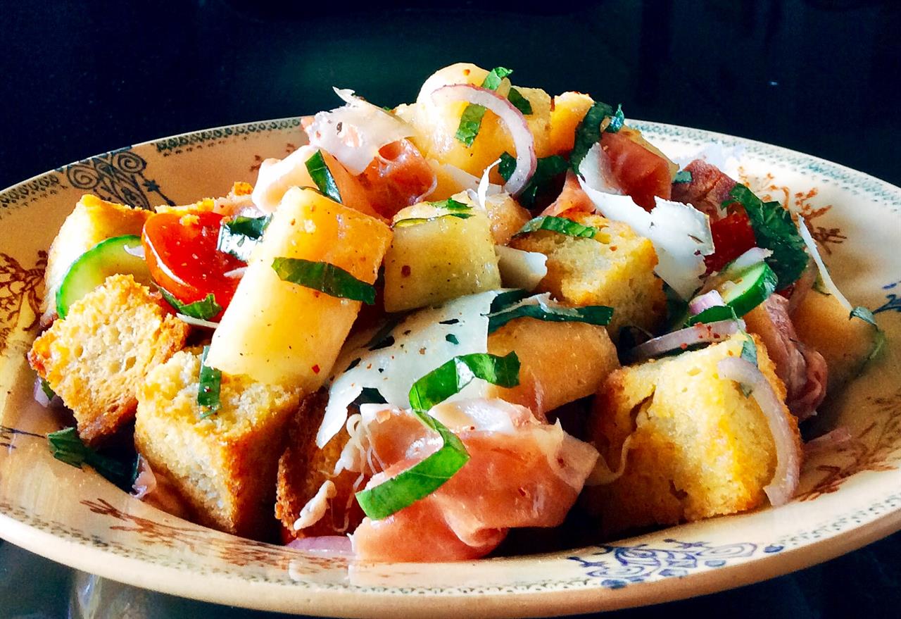ΣΑΛΑΤΑ ΣΑΝ PANZANELLA ΜΕ ΠΕΠΟΝΙ, ΠΡΟΣΟΥΤΟ & ΓΡΑΒΙΕΡΑ