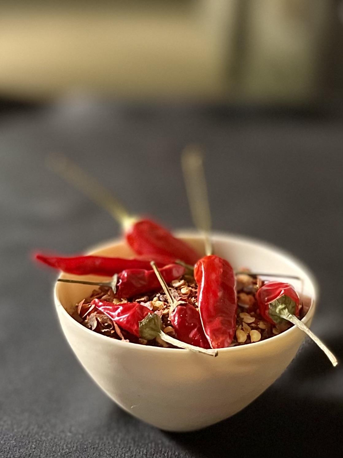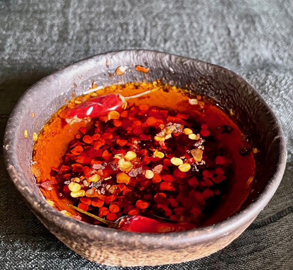 * Παρόλο που δεν είναι δύσκολο να βρούμε έτοιμο chili oil, το να το φτιάξουμε μόνοι μας είναι και εύκολο και διασκεδαστικό: Για κάθε φλυτζάνι του τσαγιού ελαιόλαδο (χρησιμοποιήστε ένα με απαλή γεύση), χρειαζόμαστε 2 γεμάτα κ.γλ. μπούκοβο και 2-3 ολόκληρα αποξηραμένα chilies. Σε ένα μικρό κατσαρολάκι ζεσταίνουμε σε μέτρια φωτιά 2 κ.σ. από το ελαιόλαδο με το μπούκοβο και τα chilies. Μόλις το λάδι αρχίσει να τσιτσιρίζει, προσθέτουμε το υπόλοιπο ελαιόλαδο και το αφήνουμε να ζεσταθεί, όχι όμως να κάψει. Θέλει λίγη προσοχή, ώστε να μην αλλάξουν χρώμα οι πιπεριές, γιατί αυτό σημαίνει πως κάηκαν και θα πρέπει να ξαναρχίσουμε τη διαδικασία. Αφήνουμε να κρυώσει και αδειάζουμε σε ένα μπουκάλι. Αυτό ήταν όλο. Το λάδι συντηρείται αρκετό καιρό, αρκεί να είναι μακριά από υγρασία και το φως του ήλιου. Εγώ το έχω κρατήσει 6 μήνες χωρίς να πάθει το παραμικρό. Όσο μένει στο μπουκάλι, τόσο σκουραίνει προς το κόκκινο και τόσο πιο καυτερό γίνεται. Σε κάθε περίπτωση, αν δεν φτιάξετε, ή δεν αγοράσετε chili oil, στη σαλάτα μπορείτε να το αντικαταστήσετε με ψιλοκομμένα φρέσκα chilies ή μπούκοβο και να προσθέσετε λίγες σταγόνες ασιατικού sesame oil.