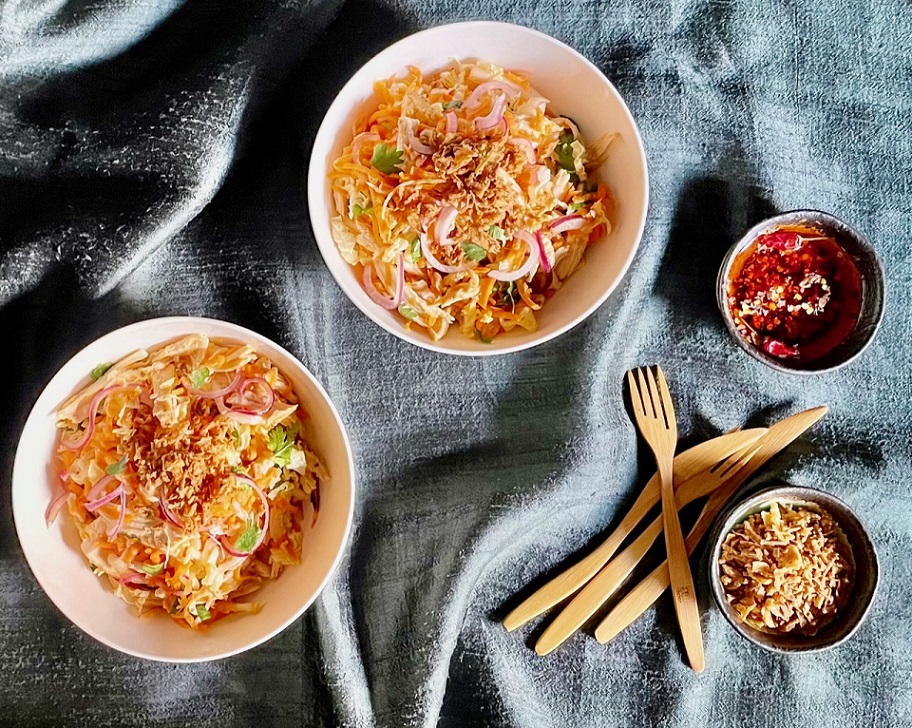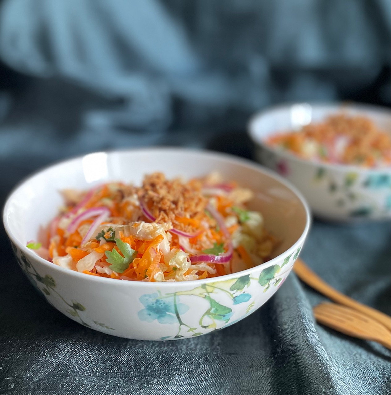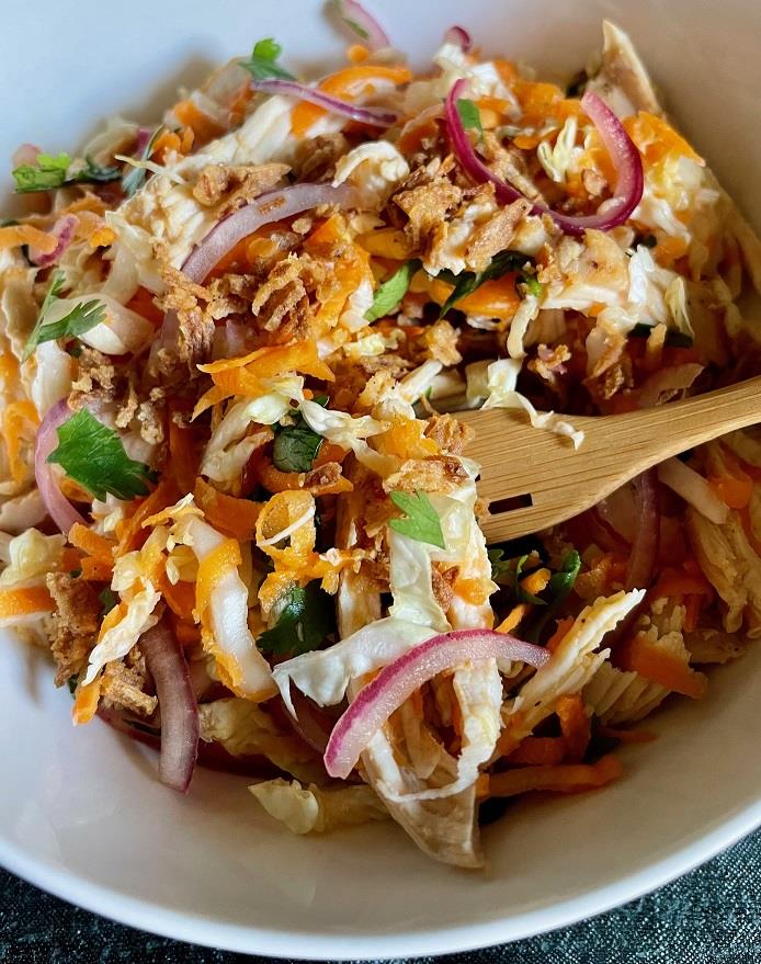 Όση ώρα ψήνεται και κρυώνει το κοτόπουλο, ετοιμάζουμε τα υπόλοιπα υλικά. Πρώτον κόβουμε ένα μέτριο ξερό κρεμμύδι σε λεπτά μισοφέγγαρα, το βάζουμε σε μπολ και προσθέτουμε 2 κ.σ. ξύδι από ρύζι (mirin). Το αφήνουμε να μαριναριστεί για 15’ και το σουρώνουμε, κρατώντας το ξύδι για το dressing. Βάζουμε σε σαλατιέρα. Δεύτερον τρίβουμε 2 μέτρια καρότα στον χοντρό τρίφτη, κόβουμε σε πολύ λεπτές λωρίδες ½ κινέζικο λάχανο και ψιλοκόβουμε ½ μάτσο φρέσκο κόλιανδρο (αν δεν μας αρέσει, αντικαθιστούμε με βασιλικό ή μαϊντανό, γνωρίζοντας πως το άρωμα θα είναι πολύ διαφορετικό, ενώ αν ήταν χειμώνας, τα μυρώνια θα ήταν τέλεια). Προσθέτουμε τα λαχανικά και το αρωματικό στη σαλατιέρα. Διαλύουμε το κοτόπουλο σε λωρίδες με τα δάχτυλά μας και το προσθέτουμε στη σαλατιέρα.