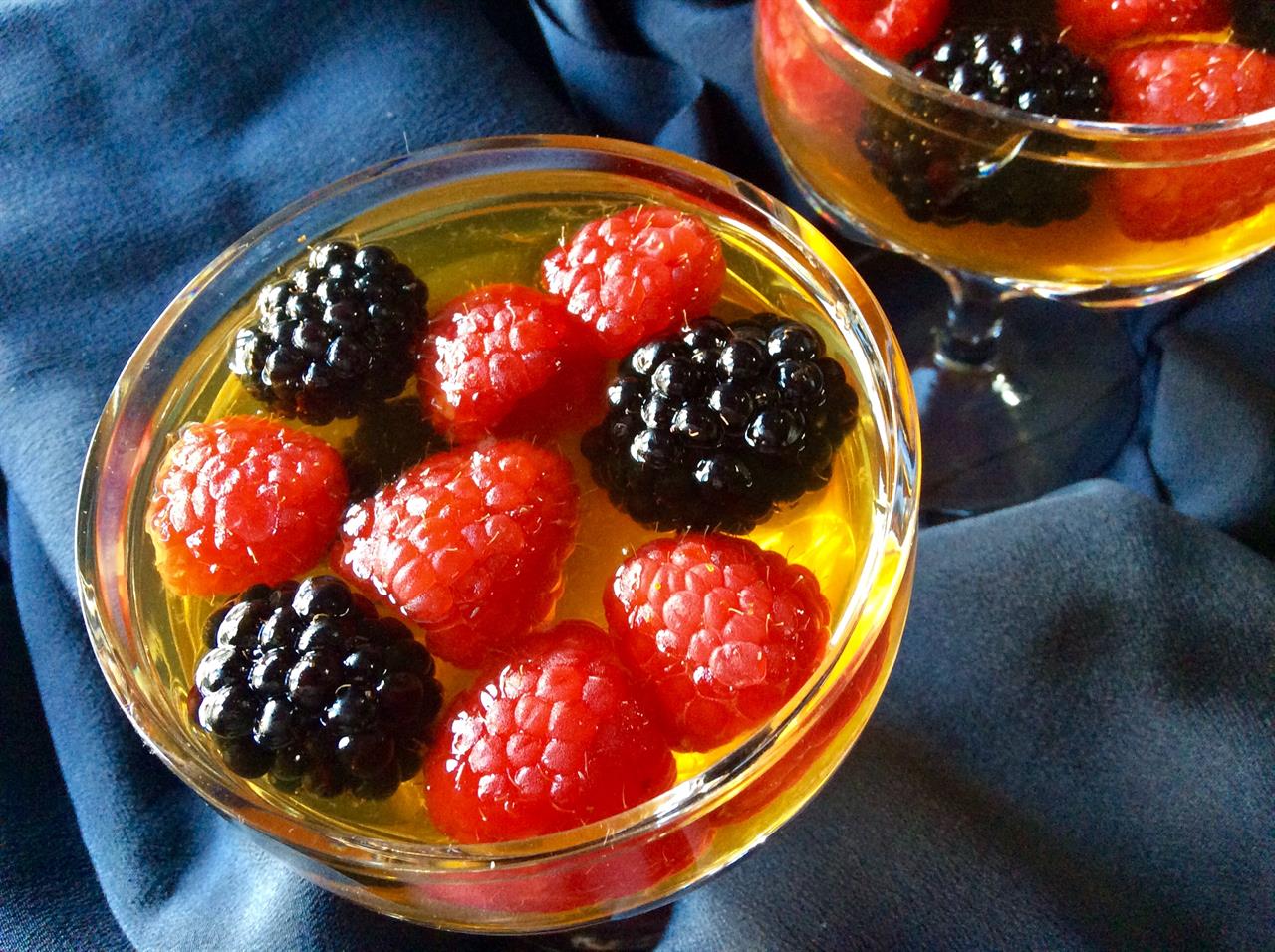 Έχω στο ψυγείο ένα μπουκάλι γλυκόπιοτο κρασί από τη Σάμο. Το χρώμα του χρυσαφένιο, από τον ήλιο που χάιδευε τα σταφύλια όσο ωρίμαζαν. Τα αρώματά του μεθυστικά, σαν τα φρούτα του ελληνικού καλοκαιριού. Αυτό θα κάνω, σκέφτηκα. Έτσι θα γιορτάσω το θερινό ηλιοστάσιο. Το κρασί θα γίνει ζελέ, θα γίνει και σιρόπι για δύο ελαφριά και δροσερά επιδόρπια. Εξαίσια και φίνα μέσα στην απλότητά τους, ακριβώς σαν το καλοκαίρι.