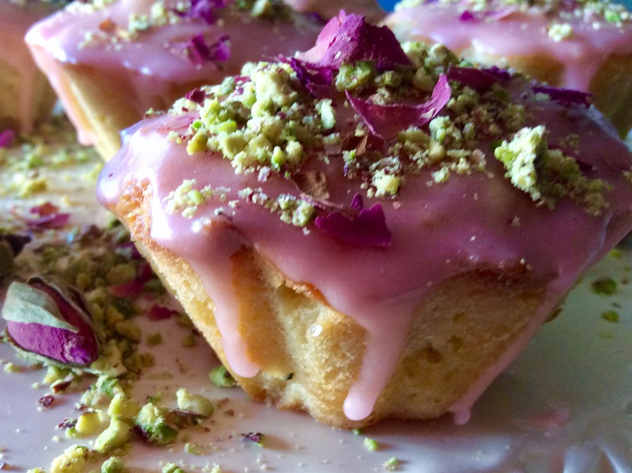 Γλάσο : Σε ένα μπολ ανακατεύουμε 10 κ.σ. ζάχαρη άχνη με τον χυμό από ½ λεμόνι και προαιρετικά 1 σταγόνα κόκκινο χρώμα ζαχαροπλαστικής. Καλό είναι να βάζουμε τον χυμό σταδιακά για να έχουμε την πυκνότητα που θέλουμε. Προσωπικά προτιμώ το γλάσο να μην είναι πολύ σφιχτό. Περιχύνουμε τα cakes με το γλάσο και περιμένουμε μέχρι να στεγνώσει. Διακοσμούμε με τριμμένα άψητα και ανάλατα φιστίκια Αιγίνης και αποξηραμένα βρώσιμα ροδοπέταλα.