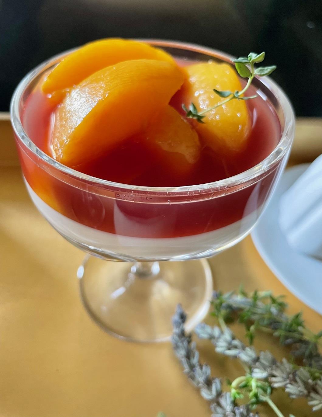 Σε μία κατσαρόλα βάζουμε 1 μπουκάλι ροζέ κρασί, 250 ml νερό, τον χυμό από 1 lime και 5 γεμάτες κουταλιές θυμαρίσιο μέλι. Φτιάχνουμε πάλι ένα πουγκί με 1 κ.σ. λεβάντα, 3 κλωνάρια φρέσκο θυμάρι και λίγους χοντροσπασμένους κόκκους μαύρου πιπεριού και το προσθέτουμε και αυτό στην κατσαρόλα. Φέρνουμε σε βρασμό, ανακατεύουμε μέχρι να λιώσει το μέλι, χαμηλώνουμε την φωτιά σε μέτρια προς χαμηλή και προσθέτουμε τα κομμάτια των ροδάκινων. Ποσάρουμε για περίπου 20΄, ή μέχρι να μαλακώσουν τα ροδάκινα, χωρίς βεβαίως να λιώσουν. Τα αφαιρούμε με τρυπητή κουτάλα, δυναμώνουμε και πάλι την φωτιά και βράζουμε μέχρι να πήξει ελαφρά το σιρόπι, για ακόμη 20΄ περίπου. Βάζουμε τα ροδάκινα και το σιρόπι σε βάζο ή δοχείο, αφού αφαιρέσουμε το πουγκί με τα αρωματικά, και μόλις χλιάνουν, παγώνουμε στο ψυγείο. Σερβίρουμε μοιράζοντας στα ποτήρια τα ροδάκινα και το σιρόπι, πάνω από την κρέμα.