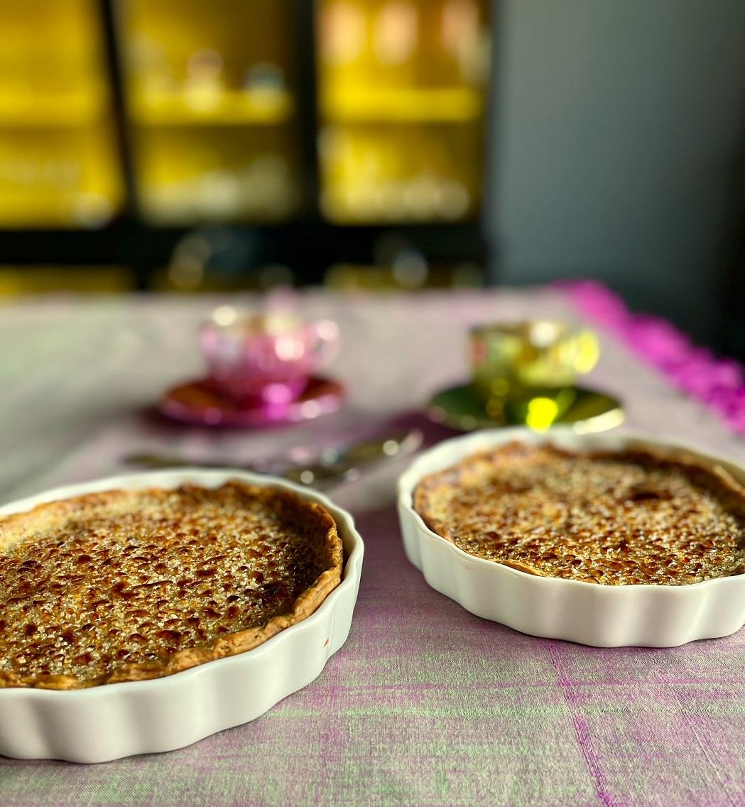 Μοιράζουμε την κρέμα στις ταρτιέρες πάνω από την ψημένη ζύμη και ψήνουμε στον φούρνο για 20΄' περίπου. Η κρέμα θα πρέπει να μην είναι μεν υγρή, αλλά να είναι λίγο τρεμουλιαστή στη μέση, γιατί θα πήξει περισσότερο στο ψυγείο. Αυτό είναι και το σχετικά πιο δύσκολο κομμάτι του γλυκού για να έχουμε μια βελούδινη κρέμα και γι’ αυτό, επίσης, η θερμοκρασία του φούρνου είναι χαμηλή. Αφήνουμε τις τάρτες να χλιάνουν και κατόπιν τις βάζουμε στο ψυγείο. Περίπου 15'΄ πριν σερβίρουμε, τις βγάζουμε από το ψυγείο για να μην είναι εντελώς παγωμένες, τις πασπαλίζουμε με ζάχαρη και τις καίμε με φλόγιστρο. Αφήνουμε για λίγα λεπτά για να στερεοποιηθεί η καραμέλα. Δεν μένει παρά να την σπάσουμε με το κουτάλι, να ακούσουμε την υπέροχη μουσική που βγάζει και να την απολαύσουμε με έναν καυτό espresso και, γιατί όχι, με ένα σφηνάκι ρούμι.