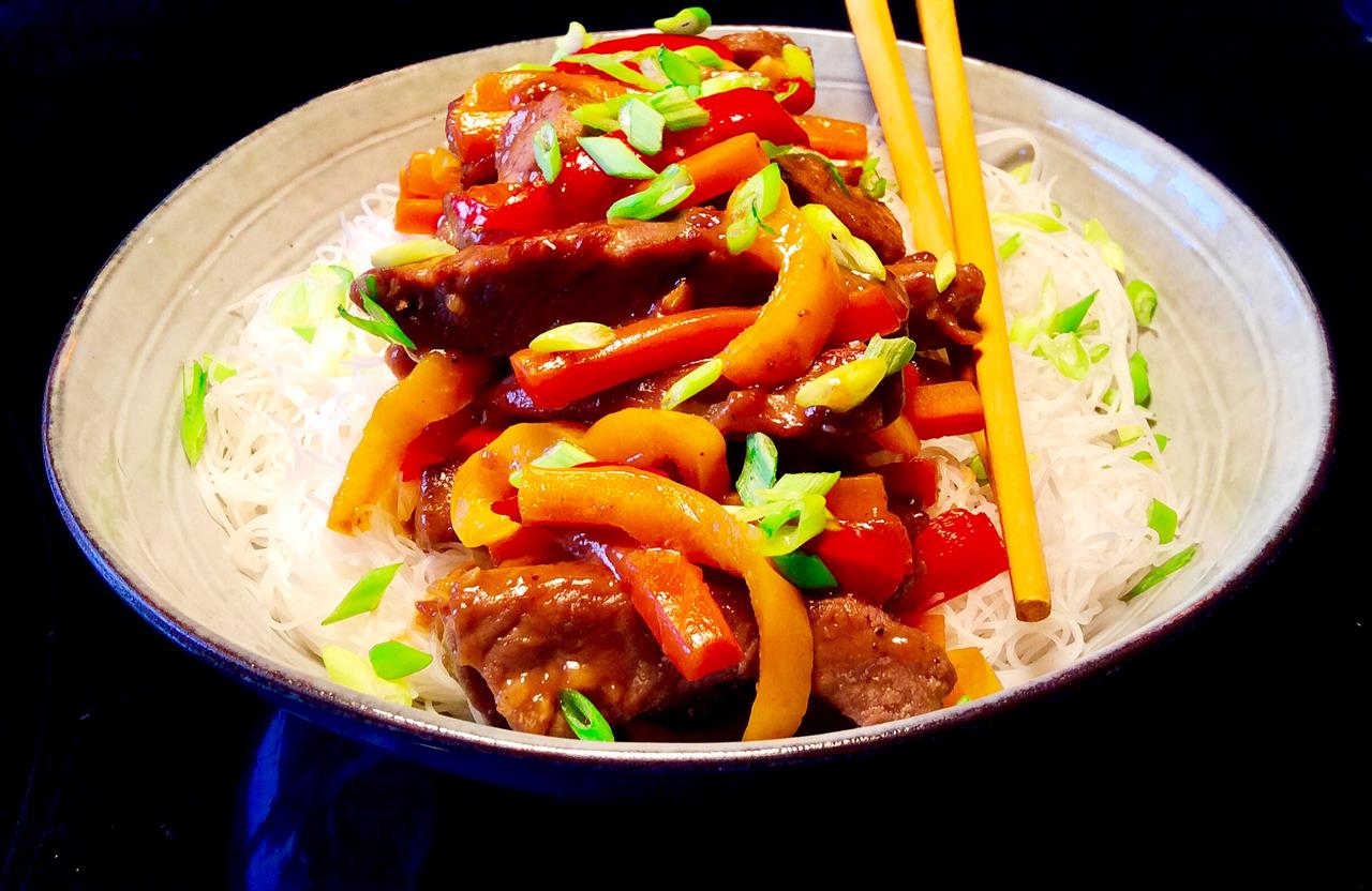 Για 2 άτομα. Ετοιμάζουμε τη μαρινάδα για το κρέας, ανακατεύοντας σε ένα μπολ 2 κ.σ. soy sauce, 1 κ.σ. κινέζικο ξύδι ρυζιού (ή εάν δεν έχουμε, ξύδι από λευκό κρασί) και 1 κ.σ. κορνφλάουρ. Ανακατεύουμε καλά για να διαλυθεί το κορνφλάουρ. Προσθέτουμε 1-2 φρέσκες πιπερίτσες chili (αφήνοντας ή όχι, λίγα ή περισσότερα σπόρια, αναλόγως πόσο καυτερό θέλουμε το φαγητό), 1 σκ. σκόρδου πολτοποιημένη με το ειδικό εργαλείο, 1 κ.γλ. κινέζικο μίγμα μπαχαρικών 5-spice (βλ. tips), 1 κ.γλ. καστανή ζάχαρη και 1 κ.γλ. sweet chili sauce (βλ. tips). Κόβουμε 1 μοσχαρίσιο φιλέτο σε λωρίδες πάχους 1-1,5 εκ. και μήκους 5 εκ. και μαρινάρουμε για λίγη ώρα, μέχρι να κόψουμε τα λαχανικά. Κόβουμε 3 πολύχρωμες πιπεριές (βλ. tips) και 1 καρότο σε λωρίδες ισομεγέθεις με αυτές του κρέατος, ένα κομμάτι ginger περίπου σαν το μεγάλο μας δάχτυλο κομμένο σε πολύ λεπτά μπαστουνάκια καθώς και 3 φρέσκα κρεμμυδάκια κομμένα σε λεπτές διαγώνιες λωρίδες (κρατάμε χωριστά το λευκό από το πράσινο μέρος : θα μαγειρέψουμε το λευκό μαζί με τα υπόλοιπα υλικά, ενώ με το ωμό πράσινο θα πασπαλίσουμε το φαγητό στο σερβίρισμα). Ζεσταίνουμε πολύ καλά το wok ή ένα βαθύ τηγάνι, προσθέτουμε 1 κ.γλ. ασιατικό σησαμέλαιο (sesame oil) και μόλις κάψει καλά, βάζουμε τα λαχανικά και λίγη από τη μαρινάδα του κρέατος. Μόλις τα λαχανικά αρχίσουν να μαλακώνουν, προσθέτουμε το κρέας που βγάζουμε από τη μαρινάδα με τρυπητή κουτάλα. Ανακατεύουμε συνεχώς και προσθέτουμε σταδιακά τη μαρινάδα, μέχρι να ψηθεί το κρέας και να έχουμε μια σχετικά πηχτή σάλτσα. Αυτό που πρέπει να προσέξουμε είναι να αφήσουμε το κρέας ζουμερό και τα λαχανικά τραγανά. Στο τέλος πασπαλίζουμε με το πράσινο μέρος των φρέσκων κρεμμυδιών που κρατήσαμε στην άκρη και, προαιρετικά, με ελαφρώς καβουρδισμένο σουσάμι ή μαυροσούσαμο. Σερβίρουμε χωρίς χρονοτριβή και συνοδεύουμε είτε με noodles ρυζιού, είτε με jasmine rice (ή, αν δεν έχουμε, basmati).