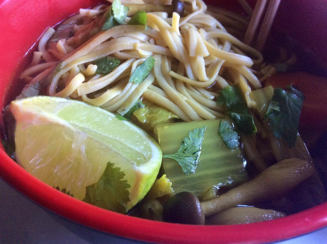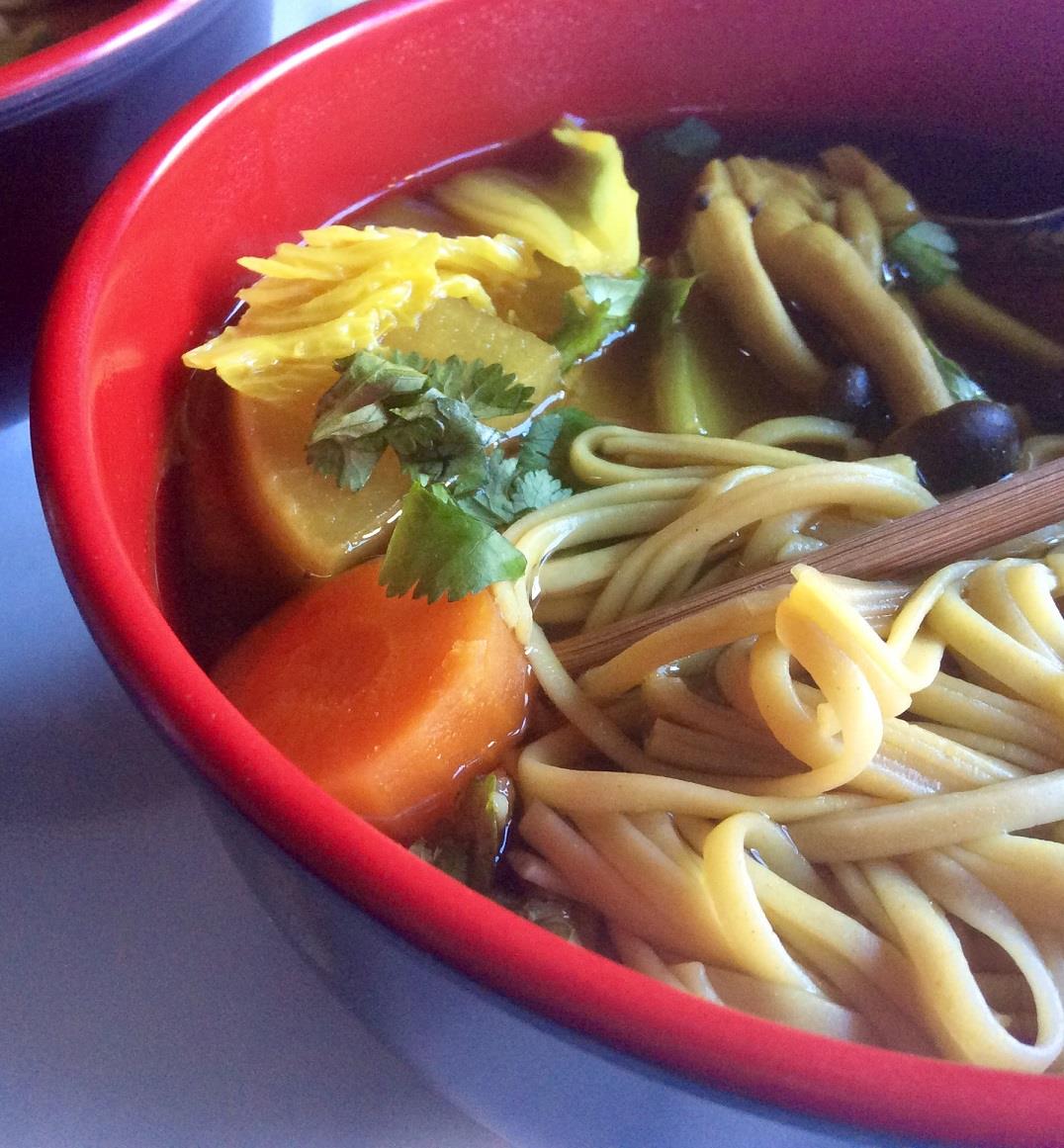 Για 6 άτομα. Σε μια κατσαρόλα σοτάρουμε σε ελάχιστο sesame oil 1 μεγαλούτσικο κομμάτι ginger κομμένο σε λεπτά μπαστουνάκια σαν σπίρτα, 1 κοφτή κ.σ. κουρκουμά σε σκόνη και 1-2 ψιλοκομμένες πιπερίτσες chili. Μόλις μυρίσει ο κουρκουμάς προσθέτουμε 2 καρότα κομμένα σε ροδέλες και 2 γογγύλια κομμένα στα τέσσερα και κατόπιν σε φέτες. Τα φέρνουμε δυο-τρεις βόλτες και σκεπάζουμε με σπιτικό ζωμό λαχανικών ή νερό. Προσθέτουμε 2 κ.σ. soy sauce και τον χυμό από 2 limes. Φέρνουμε σε ελαφρύ βρασμό και μαγειρεύουμε για 15΄- 20΄, μέχρι να μαλακώσουν τα λαχανικά, προσέχοντας όμως να μην παραβράσουν. Στο μεταξύ βράζουμε 250 γρ. noodles ρυζιού σύμφωνα με τις οδηγίες της συσκευασίας και τα κρατάμε στην άκρη. 5΄ πριν το τέλος του μαγειρέματος των λαχανικών προσθέτουμε 200 γρ. μανιτάρια και ½ κινέζικο λάχανο κομμένο σε λωρίδες. Μοιράζουμε τα noodles στα μπολ, μοιράζουμε και τα λαχανικά με τον ζωμό τους, προσθέτουμε από ½ lime, πασπαλίζουμε με φρέσκο κόλιανδρο και σερβίρουμε τη σούπα πολύ καυτή.