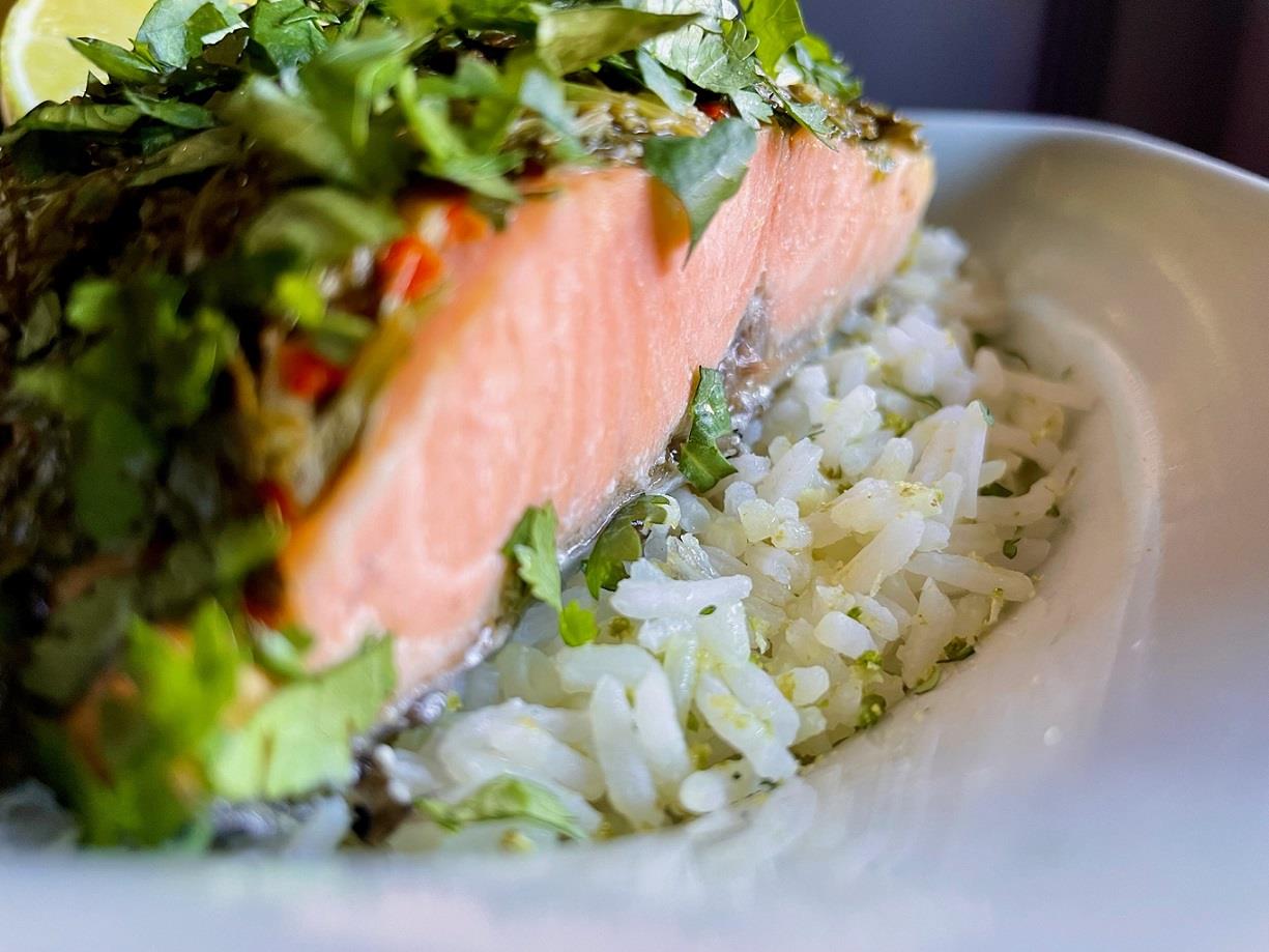 Ανοίγουμε τα πακέτα, αφαιρούμε τις φέτες του lime από τα φιλέτα του ψαριού και τα βάζουμε σε δύο μπολ ή βαθιά πιάτα πάνω από ένα στρώμα ρυζιού basmati ή jasmine που έχουμε αρωματίσει με ξύσμα lime. Από πάνω βάζουμε ακόμη λίγο ψιλοκομμένο ωμό κόλιανδρο. Σερβίρουμε με μία έξτρα φέτα lime.