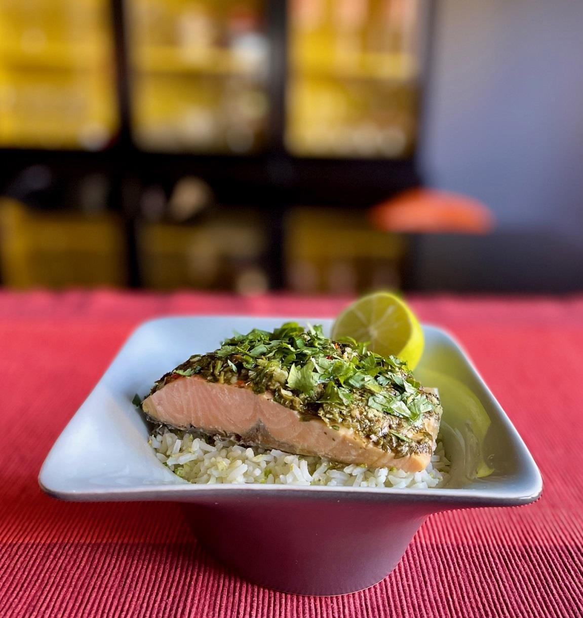 Έχουμε φροντίσει να βγάλουμε το ψάρι από το ψυγείο περίπου μισή ώρα πριν το μαγειρέψουμε. Προθερμαίνουμε τον φούρνο στους 180ο C. Στεγνώνουμε 2 φιλέτα σολομού με απορροφητικό χαρτί, τα αλείφουμε με ελάχιστο ελαιόλαδο και τα αλατοπιπερώνουμε. Ψιλοκόβουμε είτε με το μαχαίρι είτε στο multi 1 μάτσο κόλιανδρο και 1-2 πιπερίτσες chili (βλ. tips). Προσθέτουμε το ξύσμα και τον χυμό από 2 limes (μοσχολέμονα) και ένα κομμάτι ginger ίσο περίπου με το μεγάλο μας δάχτυλο τριμμένο στον λεπτό τρίφτη.
