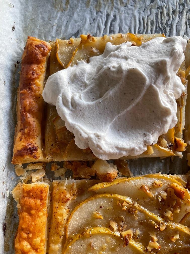 Ως οικιακή μαγείρισσα που είμαι, χωρίς ιδιαίτερες γνώσεις περί γλυκών, παρά μόνον ως πολύ καλή και πιστή φίλη τους, δεν φτιάχνω περίτεχνα γλυκά. Αυτά τα αφήνω στους αγαπημένους μου ζαχαροπλάστες. Η φθινοπωρινή τάρτα που έφτιαξα προχτές είναι πανεύκολη και γρήγορη. Είναι αρωματική και πολύ νόστιμη. Έχει διαφορετικές υφές, το κριτσανιστό φύλλο, το μαλακό ψημένο ώριμο αχλάδι, τα τραγανά καρύδια και την βελούδινη κρέμα. Έχει, επίσης, παιχνίδι με τις θερμοκρασίες, μεταξύ της ζεστής τάρτας και της παγωμένης κρέμας. Ξέχασα, έχει κι ελάχιστη λάτρα. Θέλετε κάτι άλλο από ένα γλυκό; Ελπίζω να σας κάλυψα. Ιδού η συνταγή.