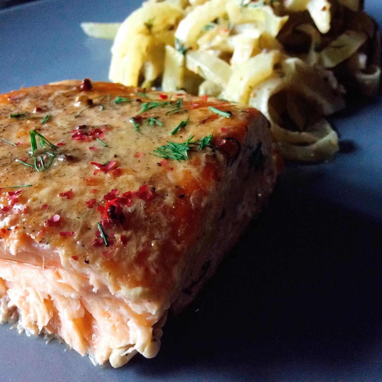 Για 2 άτομα. Αλείφουμε δύο φιλέτα σολομού με ελάχιστο ελαιόλαδο και τα αλατοπιπερώνουμε. Κόβουμε 2 μεγάλα φινόκιο σε ροδέλες. Κρατάμε στην άκρη τα πράσινα φυλλαράκια που μοιάζουν με άνηθο. Ζεσταίνουμε ένα τηγάνι και καβουρδίζουμε σε μέτρια φωτιά 1 κ.σ. μαραθόσπορους που έχουμε σπάσει στο γουδί. Μόλις μυρίσουν τους αφαιρούμε, ανεβάζουμε την ένταση της φωτιάς και ψήνουμε τα φιλέτα του ψαριού αρχίζοντας από την μεριά της πέτσας, πιέζοντάς τα με μια σπάτουλα για να μην σηκωθούν. Μόλις η πέτσα ξεροψηθεί και ξεκολλάει εύκολα από τον πάτο του σκεύους, γυρίζουμε τα φιλέτα από την άλλη πλευρά και ψήνουμε για ελάχιστα λεπτά (τα φιλέτα θα ξαναμπούν στο τηγάνι, επομένως δεν θέλουμε να τα ψήσουμε εντελώς μέχρι μέσα). Τα αφαιρούμε από το τηγάνι, στη θέση τους προσθέτουμε λίγο φρέσκο αγελαδινό βούτυρο και βάζουμε τα λαχανικά. Τα αλατοπιπερώνουμε και τα σοτάρουμε ανακατεύοντας συνεχώς με ξύλινη κουτάλα μέχρι να αρχίσουν να μαλακώνουν. Ξαναβάζουμε στο τηγάνι τους καβουρδισμένους μαραθόσπορους και σβήνουμε με 1 ποτήρι του κρασιού ούζο. Ξύνουμε τον πάτο του σκεύους για να ξεκολλήσουν οι ουσίες και μόλις εξατμισθεί το αλκοόλ, προσθέτουμε 1 γεμάτη κ.σ. μουστάρδα της αρεσκείας μας. Ανακατεύουμε και ψήνουμε για λίγο ακόμη μέχρι τα λαχανικά να μαλακώσουν, προσέχοντας βεβαίως να μην τα παραμαγειρέψουμε. Προσθέτουμε ελάχιστη κρέμα γάλακτος (όχι παραπάνω από 2 κ.σ.), ανακατεύουμε για να ομογενοποιηθεί η σάλτσα και τέλος ξαναβάζουμε στο σκεύος τα φιλέτα του σολομού. Με ένα κουτάλι τα βρέχουμε με τη σάλτσα. Ελέγχουμε τον βαθμό ψησίματος, απομακρύνουμε από την φωτιά και σερβίρουμε στα πιάτα. Πασπαλίζουμε με τα φυλλαράκια του φινόκιο (αν δεν είναι αρκετά συμπληρώνουμε με λίγο άνηθο) και τρίβουμε μπόλικο ροζ πιπέρι.