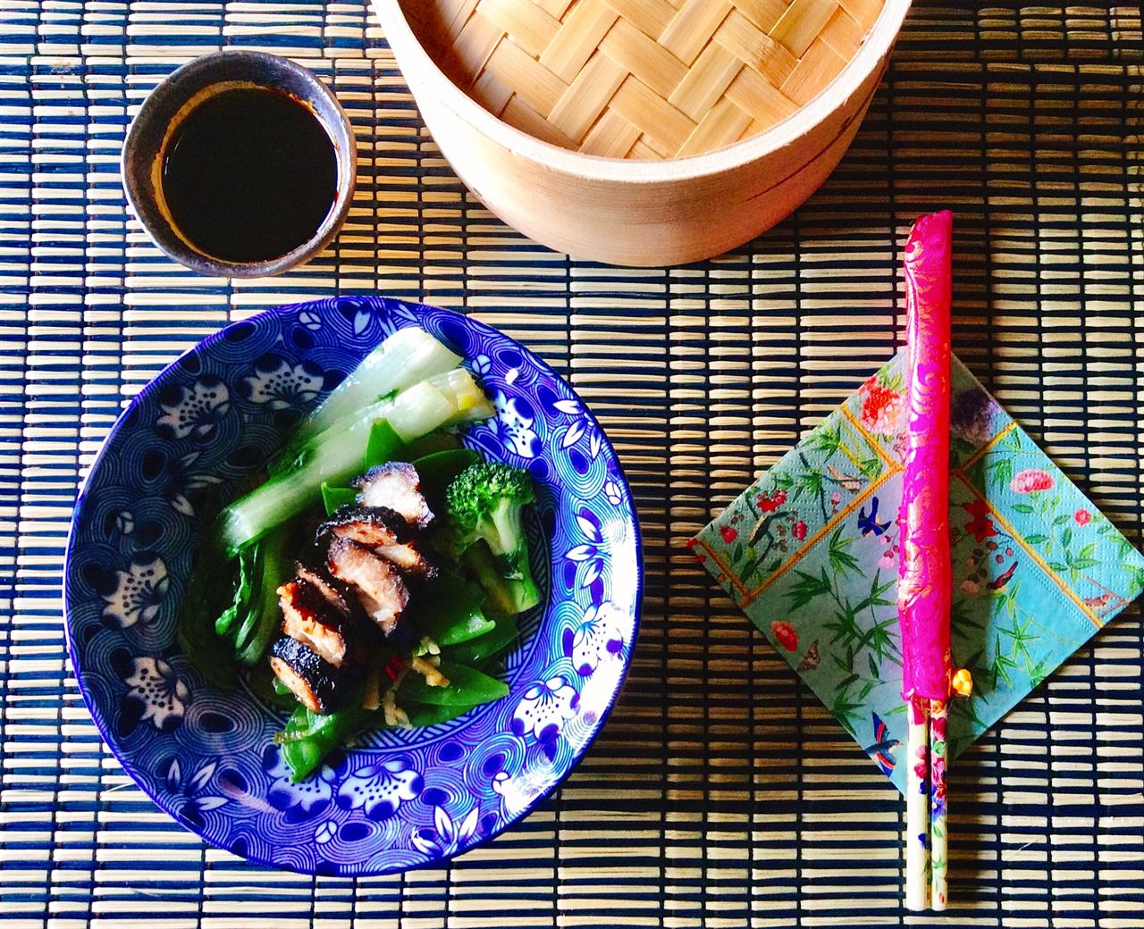 Συνοδεύουμε με διάφορα λαχανικά (μπρόκολο, καρότα, παραπούλια ή bok choy που είναι ένα είδος κινέζικου λάχανου που μοιάζει με τα παραπούλια, φινόκιο, σικορέ, τρυφερά μπιζέλια ή λεπτά φασολάκια) που έχουμε πρώτα ζεματίσει σε βραστό νερό και κατόπιν περάσει από το wok (ή βαθύ τηγάνι) σε πολύ δυνατή φωτιά με λίγο σησαμέλαιο, μπόλικο ginger, καυτερή πιπερίτσα chili και λίγη soy sauce ή fish sauce ή oyster sauce. Τέλος τα πασπαλίζουμε με σουσάμι.