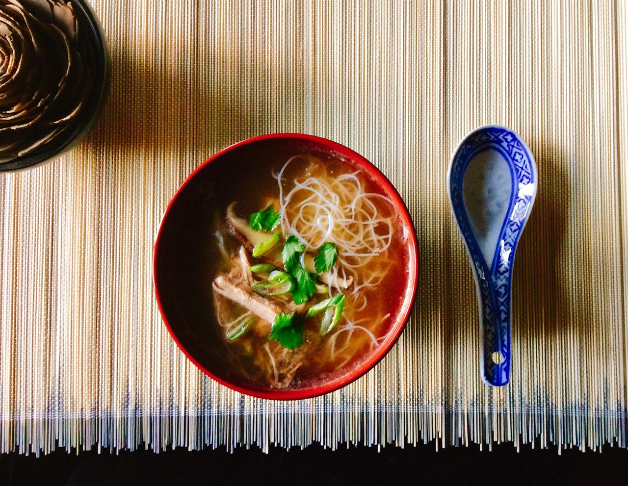 Για 6-8 άτομα. Ζητάμε από τον κρεοπώλη μας να κόψει 4 χοιρινά παϊδάκια (spare ribs). Σε μία κατσαρόλα βάζουμε 2 λίτρα νερό, το κρέας, ½ φλ. τσ. soy sauce, ½ φλ. τσ. κινέζικο κρασί για μαγείρεμα (Shaoxing), 1 αξεφλούδιστο κεφάλι σκόρδου κομμένο στη μέση κατά πλάτος, 2 κοφτές κ.σ. καστανή ζάχαρη, 2 μπαστούνια κανέλας, 3 αστεροειδείς γλυκάνισους, τις φλούδες από 1 πορτοκάλι και 1 λεμόνι και προαιρετικά 1 φρέσκια πιπερίτσα chili κομμένη στη μέση. Φέρνουμε σε βρασμό και ξαφρίζουμε για όσο διάστημα χρειαστεί. Το καλό ξάφρισμα είναι σημαντικό για διαυγείς ζωμούς. Χαμηλώνουμε την ένταση της εστίας σε χαμηλή, σκεπάζουμε την κατσαρόλα και σιγοβράζουμε για 3 ώρες. Αν χρειαστεί, προσθέτουμε σταδιακά λίγο νερό. Αφαιρούμε τα παϊδάκια, τα βάζουμε σε ένα πιάτο και τα σκεπάζουμε με διαφανή μεμβράνη. Βάζουμε την κατσαρόλα με τον ζωμό στο ψυγείο για αρκετές ώρες. Σε αυτή την φάση μπορούμε να αφήσουμε τον ζωμό και τα παϊδάκια όλη τη νύχτα στο ψυγείο και να τελειώσουμε την σούπα την επομένη. Περίπου 30΄ πριν την ώρα του φαγητού ξεκινάμε την δεύτερη φάση. Σε ένα μπολ με ζεστό νερό μουλιάζουμε 50 γρ. μανιτάρια shiitake. Ξεκοκαλίζουμε τα παϊδάκια, με ένα μαχαίρι αφαιρούμε σχολαστικά όλο το πάχος και διαλύουμε το ψαχνό με τα δάχτυλά μας. Με τρυπητή κουτάλα αφαιρούμε από τον ζωμό όλο το λίπος που έχει ανέβει στην επιφάνεια. Σουρώνουμε σε ψιλή σήτα για να απομακρύνουμε τα στερεά υλικά και φέρνουμε πάλι τον ζωμό σε ελαφρύ βρασμό. Προσθέτουμε το ξεψαχνισμένο κρέας, τα μανιτάρια και το νερό στο οποίο μούλιασαν και δοκιμάζουμε για να διορθώσουμε τη γεύση κατά τα γούστα μας. Τέλος, προσθέτουμε 200 γρ. λεπτά noodles ρυζιού, κλείνουμε το μάτι και αφήνουμε για 3’ μέχρι να μαλακώσουν τα noodles. Μοιράζουμε τη σούπα σε μπολ και γαρνίρουμε με ψιλοκομμένα φρέσκα κρεμμυδάκια και φρέσκο ψιλοκομμένο κόλιανδρο.