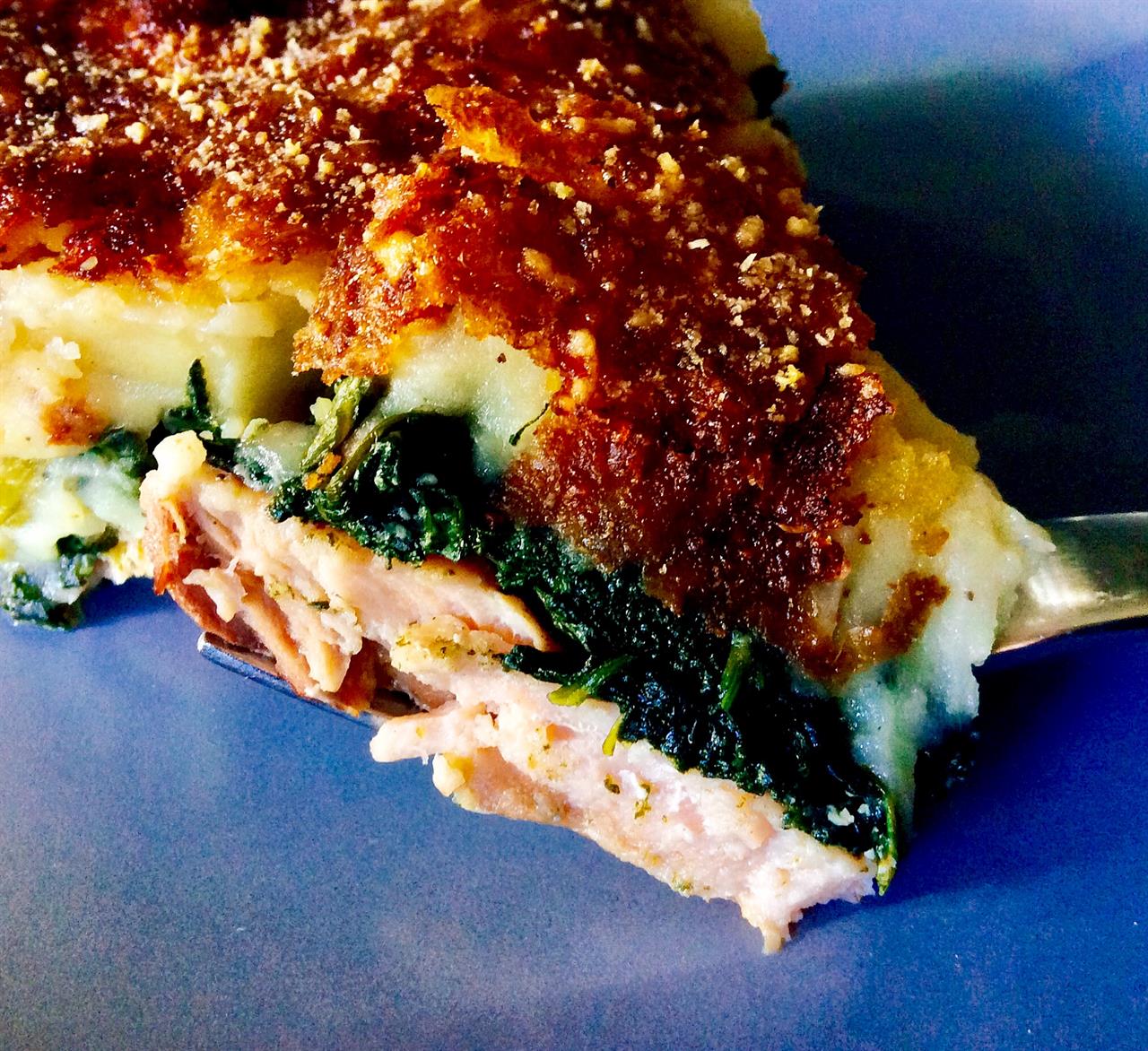 Παριζιάνικο πλέον και εστεμμένο το Hachis Parmentier, μετατράπηκε σε αστικό έδεσμα και σερβίρεται ακόμη και σήμερα σε όλες τις μπρασερί, πολύ συχνά ως πιάτο ημέρας. Επανέρχομαι στο προκείμενο και λύνω αφθωρεί και παραχρήμα τον γρίφο. Αυτό που σας ετοίμασα είναι η θαλασσινή και πιο ελαφριά του εκδοχή, με σολομό αντί για κρέας και μπόλικο σπανάκι, που του προσέθεσα και φινόκιο για το τέλειο άρωμά του. Φαγητό απλό, χορταστικό, αρκετά υγιεινό και κυρίως νόστιμο.