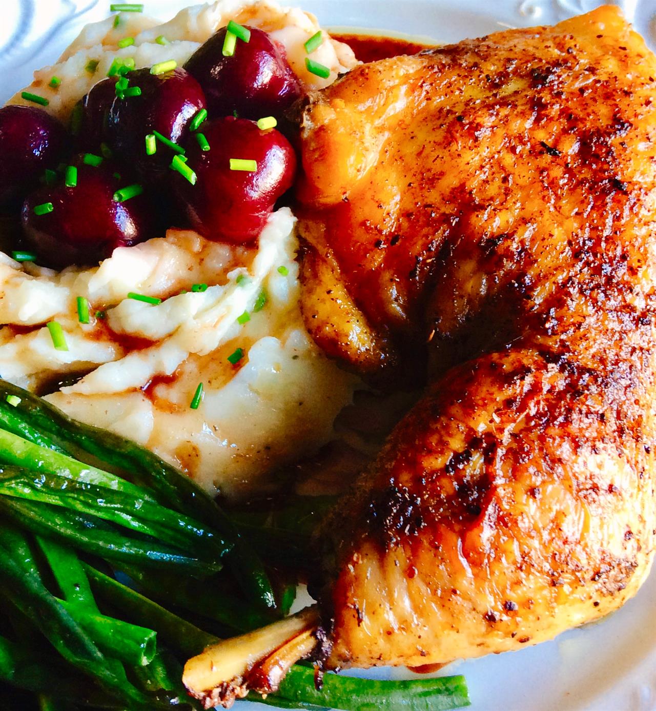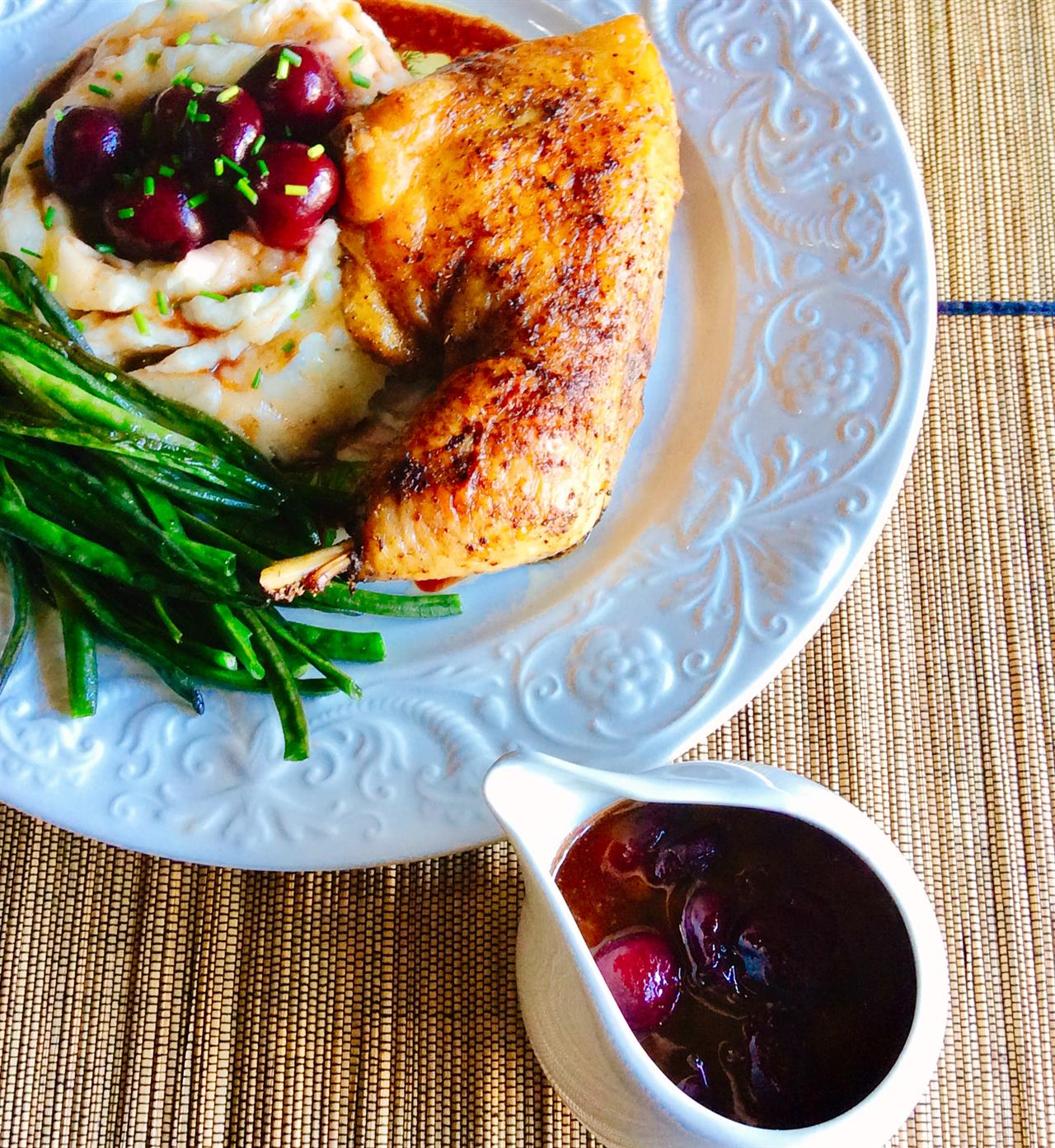 Ζητάμε από τον κρεοπώλη να κόψει σε μερίδες ένα κοτόπουλο, αφήνοντας τα κόκκαλα και την πέτσα (βλ. tips). Προθερμαίνουμε τον φούρνο στους 180ο C στη λειτουργία του αέρα. Σκουπίζουμε πολύ καλά τα κομμάτια του κοτόπουλου για να αφαιρέσουμε όλη την υγρασία (σημαντικό βήμα για τραγανή πέτσα). Τα αλατοπιπερώνουμε, τα πασπαλίζουμε με λίγο μίγμα μπαχαρικών five-spice (βλ. tips) και τα αλείφουμε με λίγο ελαιόλαδο. Ζεσταίνουμε πολύ καλά ένα τηγάνι κατάλληλο και για τον φούρνο και σοτάρουμε τα κομμάτια του κοτόπουλου μέχρι να ροδοκοκκινίσουν από όλες τις πλευρές. Σκεπάζουμε σφιχτά με λαδόκολλα και αλουμινόχαρτο και φουρνίζουμε για λίγο παραπάνω από μία ώρα. Αν κατά τη διάρκεια του ψησίματος δούμε ότι χρειάζονται υγρά, προσθέτουμε σταδιακά λίγο βραστό νερό. Κατόπιν ξεσκεπάζουμε και αφήνουμε τις μερίδες του κοτόπουλου να ξεροψηθούν για περίπου 20΄, φροντίζοντας να τις βρέχουμε ανά πεντάλεπτο με το ζουμί που άφησαν στο ψήσιμο για να γίνει η πέτσα τραγανή. Αφαιρούμε το κρέας από το σκεύος και το κρατάμε στην άκρη. Ρίχνουμε στο ταψί λίγο βραστό νερό και με μια ξύλινη κουτάλα ξύνουμε καλά τον πάτο για να πάρουμε όλο το νόστιμο ζουμί του ψησίματος. Ρίχνουμε το ζουμί σε ένα μικρό κατσαρολάκι και ξαναβάζουμε το κοτόπουλο στο ταψί, το οποίο βάζουμε πίσω στον σβηστό, πλην όμως ζεστό ακόμη φούρνο. Φέρνουμε σε βρασμό το ζουμί στο κατσαρολάκι και προσθέτουμε 1 ποτήρι κόκκινο ξηρό κρασί, 1 σφηνάκι ξύδι από κόκκινο κρασί (ταιριάζει απόλυτα και το ξύδι από framboises/σμέουρα) και 1 κ.σ. μέλι ή πετιμέζι ή σκούρα καστανή ζάχαρη. Προσθέτουμε 500 γρ. ξεκουκουτσιασμένα μαύρα κεράσια ή πετροκέρασα αν τα προτιμούμε, τα αφήνουμε για ελάχιστα λεπτά (ίσα ίσα για να μην είναι εντελώς ωμά, με προσοχή όμως να μην λιώσουν) και τα αφαιρούμε με τρυπητή κουτάλα. Συνεχίζουμε να βράζουμε τη σάλτσα σε δυνατή φωτιά μέχρι να πήξει και να καραμελώσει ελαφρώς. Διορθώνουμε τη γεύση και τέλος τη δένουμε με 2-3 κύβους παγωμένου βουτύρου, που προσθέτουμε στη σάλτσα έναν-έναν, ανακατεύοντας συνεχώς με το σύρμα. Τέλος, ξαναβάζουμε τα κεράσια στη σάλτσα. Σερβίρουμε το κοτόπουλο με τη σάλτσα και συνοδεύουμε ιδανικά με βελούδινο πουρέ πατάτας. Πασπαλίζουμε με ψιλοκομμένο σχινόπρασο, το οποίο προσθέτει δροσιά και λεπτό άρωμα στο σύνολο του φαγητού.