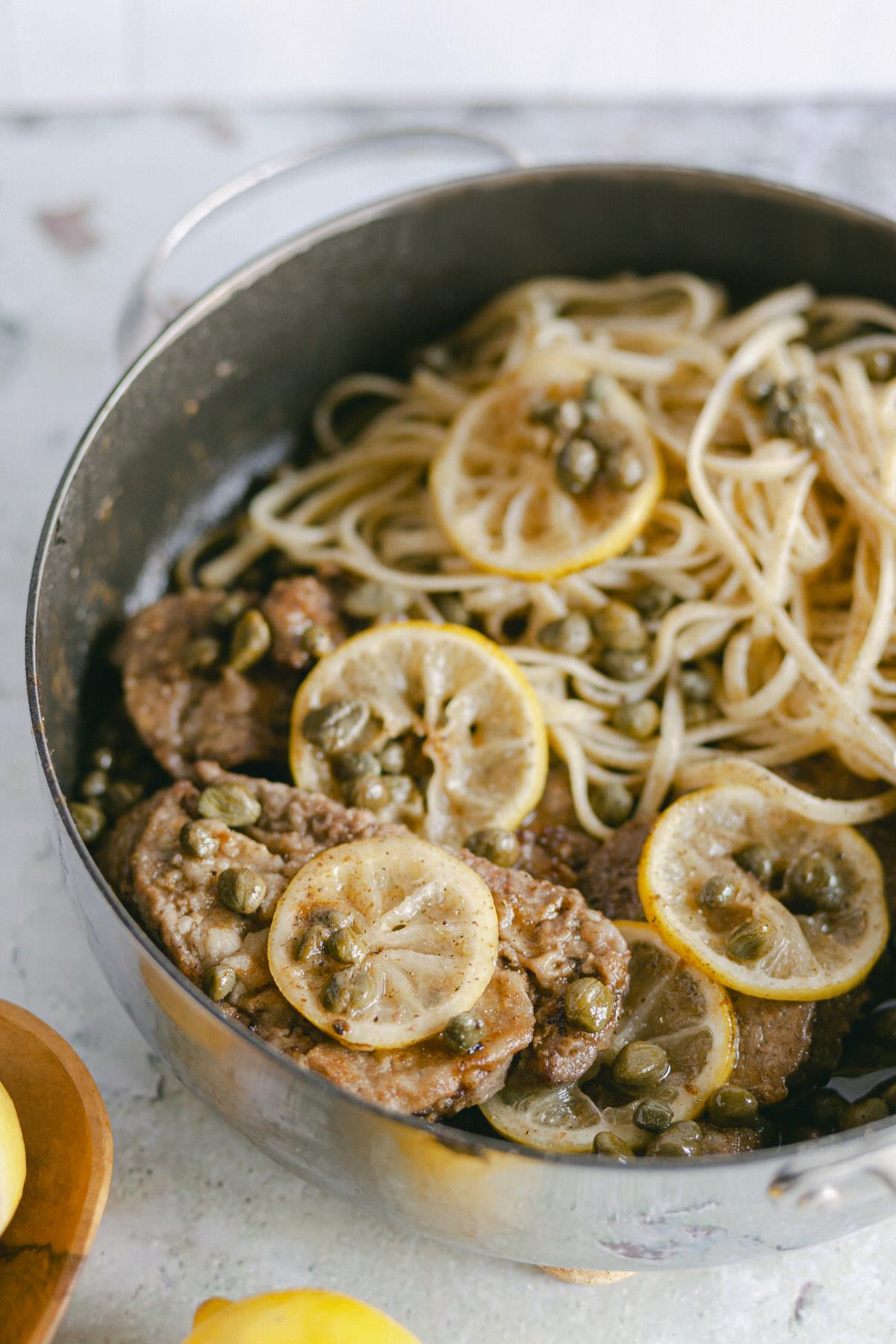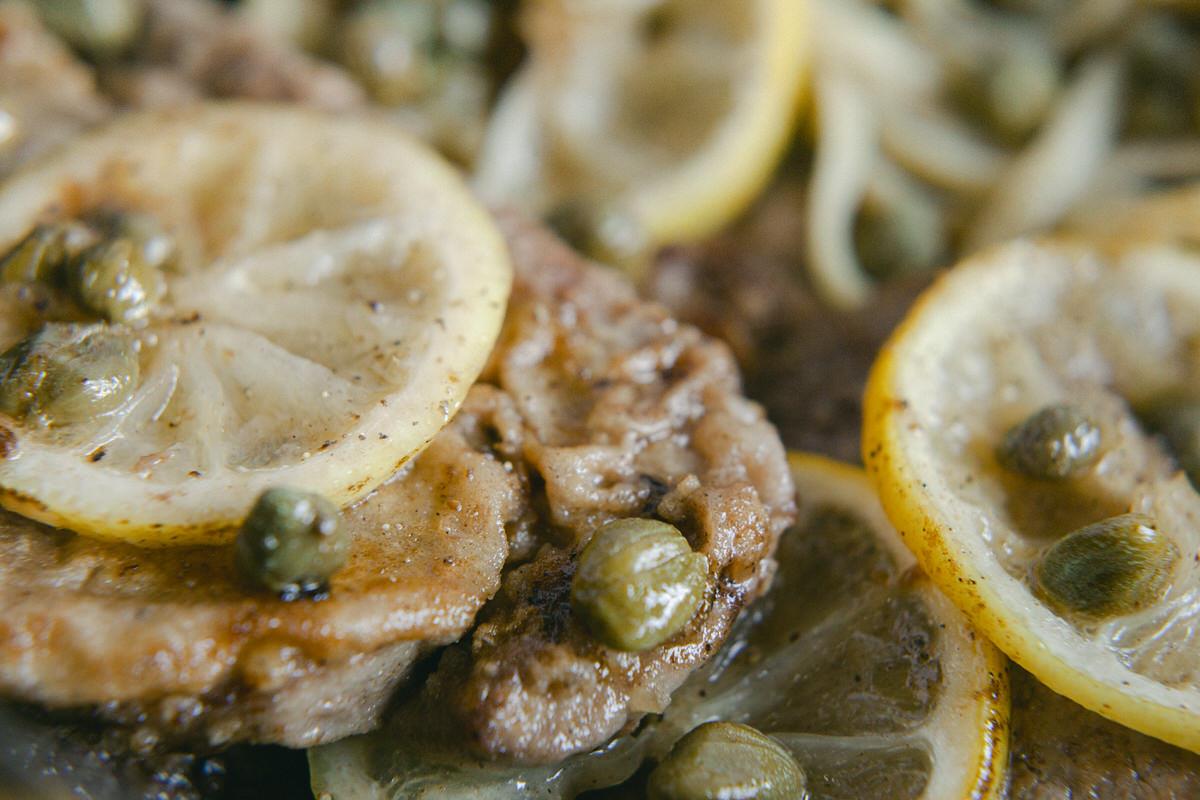 Για 4 άτομα. Ζητάμε από τον κρεοπώλη μας να κόψει σε λεπτές φέτες 500 γρ. φιλέτο από μοσχαράκι γάλακτος και να τις χτυπήσει λίγο για να έχουν ίδιο πάχος. Εδώ βρίσκεται το πιο σημαντικό αλλά και λεπτό στοιχείο της συνταγής : με αυτό εννοώ πως το κρέας δεν πρέπει να γίνει τόσο λεπτό όπως αυτό του σνίτσελ, το οποίο είναι σχεδόν διαφανές, ούτε να χτυπηθεί με μανία για να σπάσουν οι ίνες του‧ άλλωστε το μοσχαράκι γάλακτος είναι πολύ τρυφερό κι αν χτυπηθεί πολύ, θα διαλυθεί. Οι φέτες του κρέατος πρέπει να έχουν πάχος ελάχιστα λιγότερο από 1 εκ. Προσωπικά, για να είμαι σίγουρη πως θα έχω το αποτέλεσμα που θέλω, αγοράζω ένα κομμάτι ολόκληρο, το κόβω σε φέτες (κόβεται πανεύκολα με ένα καλό μαχαίρι), τις βάζω ανάμεσα από δύο λαδόκολλες, κι αντί να τις χτυπήσω με το ειδικό εργαλείο, περνάω από πάνω τους ελαφρά τον πλάστη. Στεγνώνουμε επιμελώς τις φέτες του κρέατος, τις αλατοπιπερώνουμε και τις βουτάμε σε ένα μπολ με αλεύρι. Ζεσταίνουμε καλά ένα βαθύ τηγάνι και βάζουμε λίγο βούτυρο και λίγο ελαιόλαδο (από 1 κ.σ.). Τηγανίζουμε ελαφρά τις φέτες του κρέατος μέχρι να πάρουν χρώμα από όλες τις πλευρές, σε μέτρια προς δυνατή φωτιά, αφού τις τινάξουμε πολύ καλά για να φύγει το περίσσιο αλεύρι και να μείνει μόνο ένα ίχνος, σαν ελαφριά πούδρα. Εννοείται πως δεν στριμώχνουμε όλο το κρέας μεμιάς, αλλά το τηγανίζουμε σε δόσεις και μεταφέρουμε κάθε δόση σε μπολ. Αφού πάρουν χρώμα όλες οι φέτες και από τις δύο πλευρές και το τηγάνι αδειάσει, σβήνουμε με ένα ποτηράκι λευκό ξηρό κρασί και ξύνουμε με ξύλινη κουτάλα τον πάτο του σκεύους για να ξεκολλήσουν οι λεγόμενες «καραμέλες» του κρέατος, οι οποίες, μαζί με το λίγο αλεύρι που έχει αφήσει το κρέας, τα υγρά και το βούτυρο, θα φτιάξουν στο τέλος τη σάλτσα. Χαμηλώνουμε την φωτιά σε μέτρια και μόλις εξατμισθεί το αλκοόλ προσθέτουμε 100 ml νερό (ή σπιτικό ζωμό, εάν έχουμε) και ένα λεμόνι κομμένο σε πολύ λεπτές φέτες. Μόλις η σάλτσα αρχίσει να πήζει προσθέτουμε 1 μεγάλη χούφτα καλά ξαρμυρισμένη κάπαρη και 2 κ.σ. βούτυρο. Ανακατεύουμε με το σύρμα, ξαναβάζουμε μέσα στο τηγάνι τις φέτες του κρέατος και με ένα κουτάλι τις περιχύνουμε με τη σάλτσα για ελάχιστα λεπτά. Αποσύρουμε από την εστία και σερβίρουμε, πασπαλίζοντας με λίγο ψιλοκομμένο μαϊντανό (δεν τον βλέπετε στις φωτογραφίες γιατί απλώς τον ξέχασα. Προσωπικά δεν μου έλειψε, νομίζω όμως ότι η δροσιά του και το λεπτό του άρωμα ταιριάζουν πολύ).