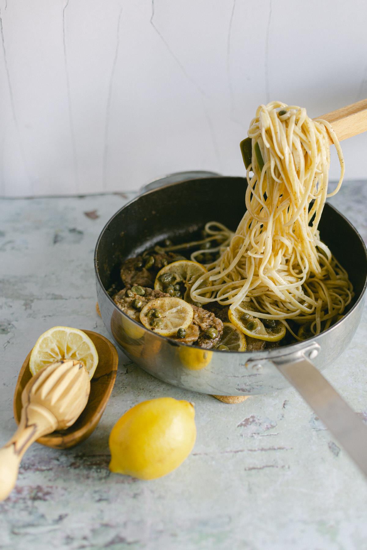 Η συνταγή έχει ιταλική καταγωγή και είναι σκαλοπίνια από μοσχαράκι γάλακτος με σάλτσα βουτύρου-λεμονιού και κάπαρη. Ονομάζεται piccata di vitello al limone, όπου piccata σημαίνει το κρέας που έχει κοπεί σε λεπτές φέτες οι οποίες έχουν χτυπηθεί ελαφρά για να γίνουν σκαλοπίνια, αλευρωθεί και τηγανιστεί, ενώ η σάλτσα πήζει με το λίγο αλεύρι που έχει μείνει στο τηγάνι, βούτυρο και λεμόνι. Αυτό που με μπέρδεψε είναι η κάπαρη, την οποία βρήκα σε ελάχιστες ιταλικές συνταγές. Αντιθέτως, σε διάφορα άλλα sites και blogs μαγειρικής, κυρίως αμερικάνικα, piccata χωρίς κάπαρη δεν νοείται. Επίσης, οι Αμερικάνοι προτιμούν το κοτόπουλο από το μοσχάρι, ενίοτε και φιλέτο ψαριού. Το γεγονός, παρόλο που με μπέρδεψε, δεν με εντυπωσίασε και τόσο πολύ, γιατί είναι γνωστό πως οι συνταγές που ταξίδεψαν από τους Ιταλούς μετανάστες στην δεύτερη πατρίδα τους άλλαξαν πολύ στο πέρασμα των χρόνων. Αν σε αυτό προσθέσουμε και την φυσική εξέλιξη της μαγειρικής τέχνης, πολλά φαγητά είναι σήμερα αγνώριστα. Κι όχι πάντα για κακό, αν κι αυτό το θέμα ανήκει σε άλλη συζήτηση, την οποία σκοπεύω να ανοίξω κάποια στιγμή.