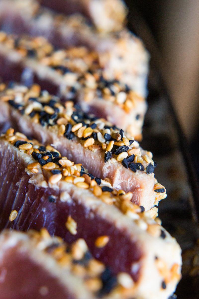 Για 2 άτομα. Σκουπίζουμε επιμελώς δύο φιλέτα τόνου με απορροφητικό χαρτί. Τα αλατοπιπερώνουμε και τα αλείφουμε με ελάχιστο ασιατικό sesame oil (ή ελαιόλαδο, αν δεν έχουμε : η ποσότητα είναι τόσο μικρή, που δεν πειράζει). Σε ένα αντικολλητικό τηγάνι καβουρδίζουμε ελαφρά 2 χούφτες ανάμικτους σπόρους σουσαμιού (λευκό και μαυροσούσαμο). Τους αφαιρούμε από το σκεύος και τους απλώνουμε σε ένα ρηχό πιάτο. Στη θέση τους στο καυτό τηγάνι ψήνουμε τα φιλέτα του ψαριού για 20΄΄- 30΄΄ από κάθε πλευρά : όπως θα δείτε στις φωτογραφίες, το ζητούμενο είναι το ψάρι να πάρει χρώμα μόνο εξωτερικά, ενώ το εσωτερικό θα πρέπει να μείνει ωμό. Βγάζουμε τα φιλέτα από το σκεύος, τα αλείφουμε με ένα πινέλο με λίγο wasabi και κατόπιν τα ρολάρουμε στο σουσάμι, πιέζοντας ελαφρά για να κολλήσει το σουσάμι παντού. Τυλίγουμε σφιχτά κάθε φιλέτο σε διαφανή μεμβράνη και τα κρυώνουμε στο ψυγείο μέχρι να ετοιμάσουμε τη συνοδευτική salsa : Κόβουμε μία φέτα καρπουζιού και 1 μικρό αγγούρι με τη φλούδα του σε πολύ μικρούς κύβους και τους βάζουμε σε ένα μπολ. Κόβουμε ½ μικρό κρεμμύδι σε ακόμη πιο μικρούς κύβους και τους προσθέτουμε στο μπολ. Προσθέτουμε 1 μικρό κομμάτι φρέσκο ginger τριμμένο στον λεπτό τρίφτη και ψιλοκομμένο φρέσκο κόλιανδρο. Αν αγαπάμε τα πολύ πικάντικα, μπορούμε να προσθέσουμε και μία ψιλοκομμένη πιπερίτσα chili. Αρτύζουμε με χυμό από ½ μοσχολέμονο (lime), λίγο ξύδι ρυζιού, λίγη soy sauce και ½ κ.γλ. ζάχαρη. Ανακατεύουμε καλά, δοκιμάζουμε και διορθώνουμε τη γεύση εάν χρειαστεί. Βγάζουμε τα φιλέτα του τόνου από το ψυγείο, αφαιρούμε τη μεμβράνη και με ένα καλά ακονισμένο μαχαίρι του σεφ τα κόβουμε σε λωρίδες. Σερβίρουμε τον τόνο με τη salsa και λίγο wasabi στο πλάι για έξτρα πικάντικη γεύση. Για ένα πλήρες γεύμα συνοδεύουμε με ρύζι ατμού (basmati ή jasmine rice) πασπαλισμένο με ξύσμα μοσχολέμονου.