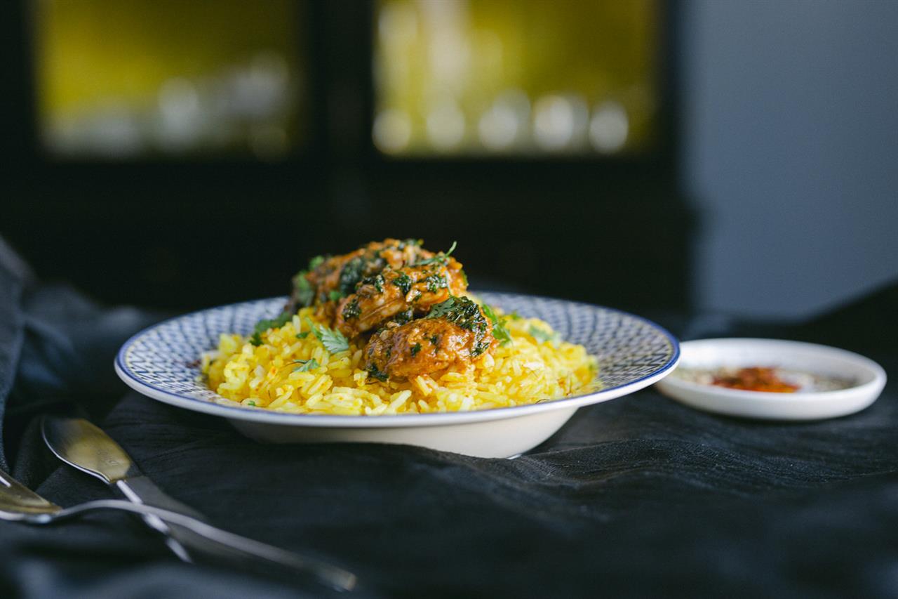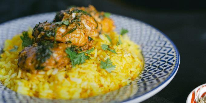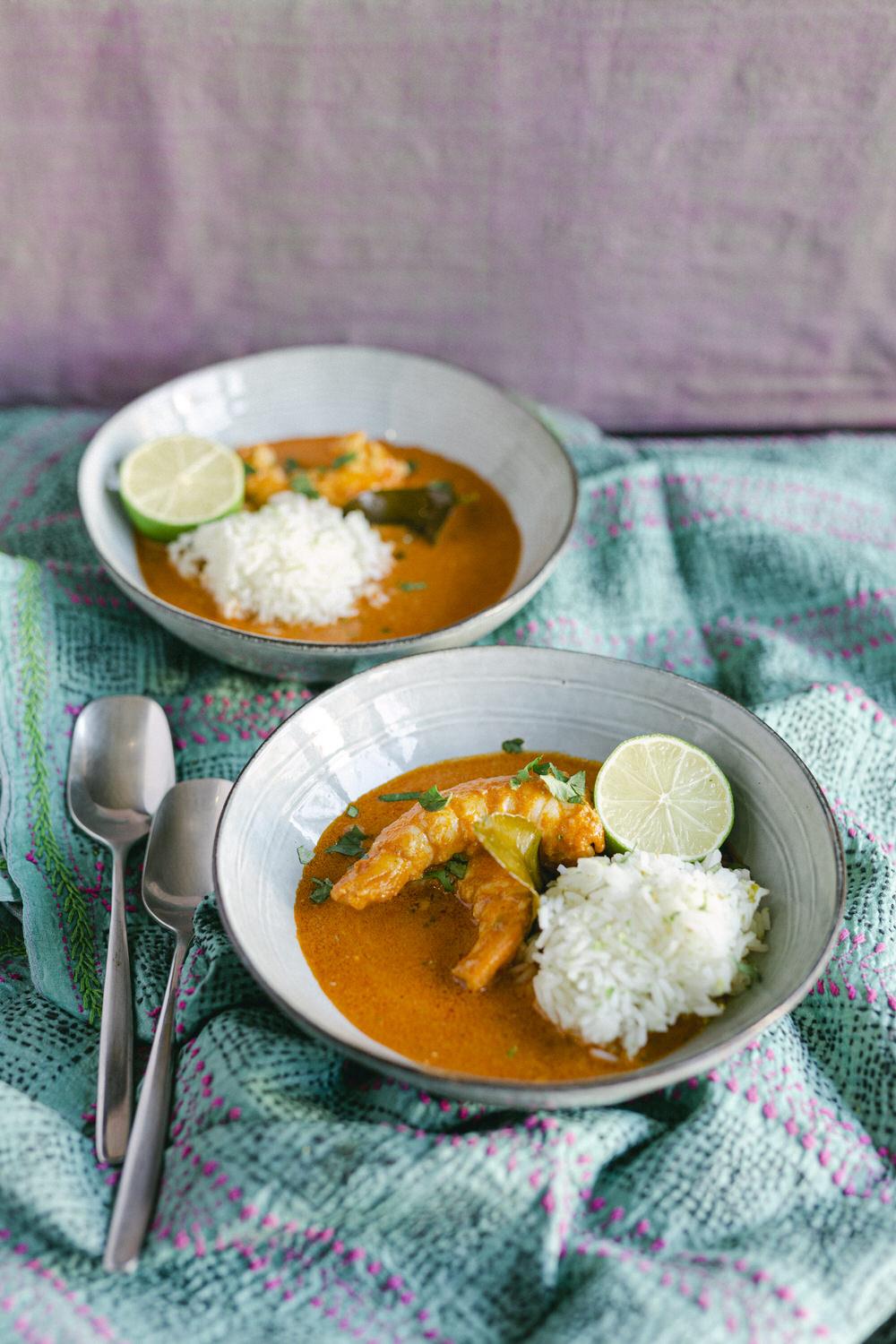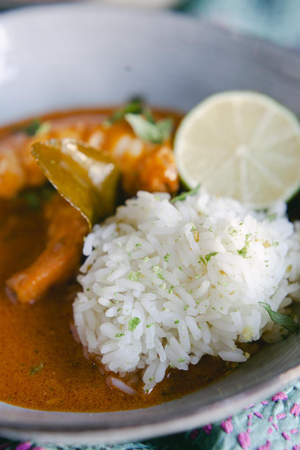 Μοιράζουμε τη σάλτσα και τις γαρίδες σε βαθιά πιάτα, προσθέτουμε στο πλάι από 1 φλιτζάνι ρύζι basmati ή jasmine το οποίο έχουμε βράσει είτε σε κοινό νερό είτε σε νερό καρύδας και ανακατέψει με ξύσμα lime και γαρνίρουμε με μισό lime και ψιλοκομμένο φρέσκο κόλιανδρο.