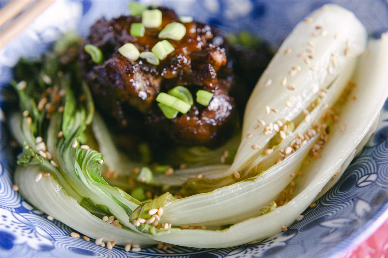 Πασπαλίζουμε τα κομμάτια του κρέατος με ψιλοκομμένα φρέσκα κρεμμυδάκια (χρησιμοποιούμε περισσότερο το πράσινο μέρος) και συνοδεύουμε με λαχανικά που σοτάρουμε σε δυνατή φωτιά με λίγο sesame oil, λίγη soy sauce, ψιλοκομμένο ginger και σκόρδο και κρασί Xaoshing. Τα πασπαλίζουμε με ελαφρώς καβουρδισμένο σουσάμι. Διαλέγουμε όποια λαχανικά μας αρέσουν (καρότα, κινέζικο λάχανο ή το επίσης κινέζικο bok choy – αυτό που βλέπετε στην φωτογραφία – μπρόκολο, μπιζέλια, λεπτά φασολάκια, αρακά, πιπεριές, κλπ). Τα λαχανικά δεν χρειάζεται να μπλανσαριστούν πριν, γιατί η δυνατή φωτιά θα τα μαλακώσει και θα τα μαράνει αλλά συγχρόνως θα τα αφήσει τραγανά, όπως δηλαδή πρέπει να είναι. Το ρύζι ατμού μπορεί να συμπληρώσει τα συνοδευτικά λαχανικά.