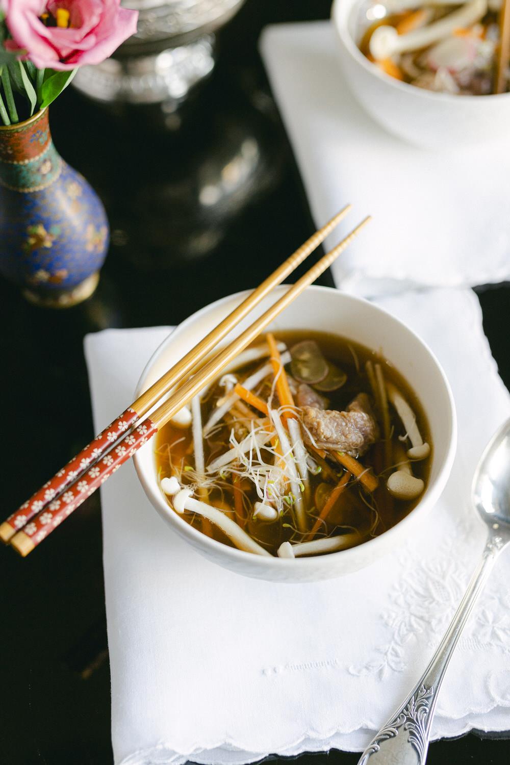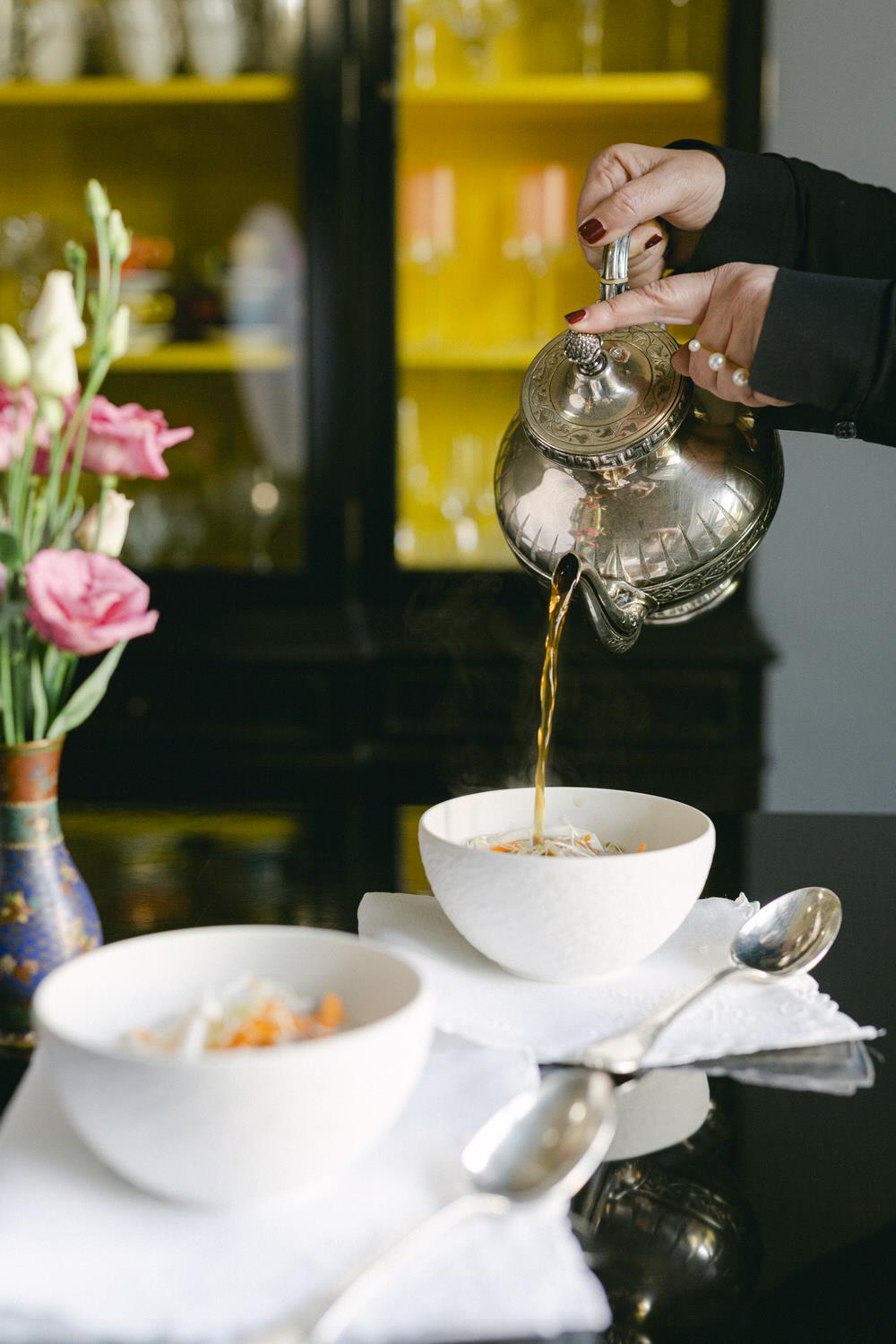 Μην φανταστείτε χαβιάρια και σαμπάνιες, ούτε αστακούς και χελιδονοφωλιές. Ούτε πολύπλοκα και πολύωρα μαγειρέματα. Για σάλτσες και βαριές γεύσεις ούτε λόγος. Αρκούν ένα τρυφερό μοσχαρίσιο φιλέτο με όμορφα κομμένα πολύχρωμα λαχανικά κι ένας ζωμός καυτός για να ζεσταθεί το μέσα μας και αρκούντως spicy για να ξυπνήσουν οι αισθήσεις. Η εξτραβαγκάντζα έγκειται στην τελετουργία του σερβιρίσματος. Αντί να σερβίρουμε τη σούπα όπως το κάνουμε συνήθως, βάζουμε τον ζωμό στο πιο όμορφο τσαγερό μας και τον ρίχνουμε καυτό μέσα στα μπολ που έχουμε γεμίσει με το κρέας και τα λαχανικά.