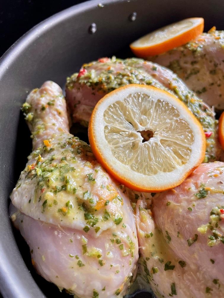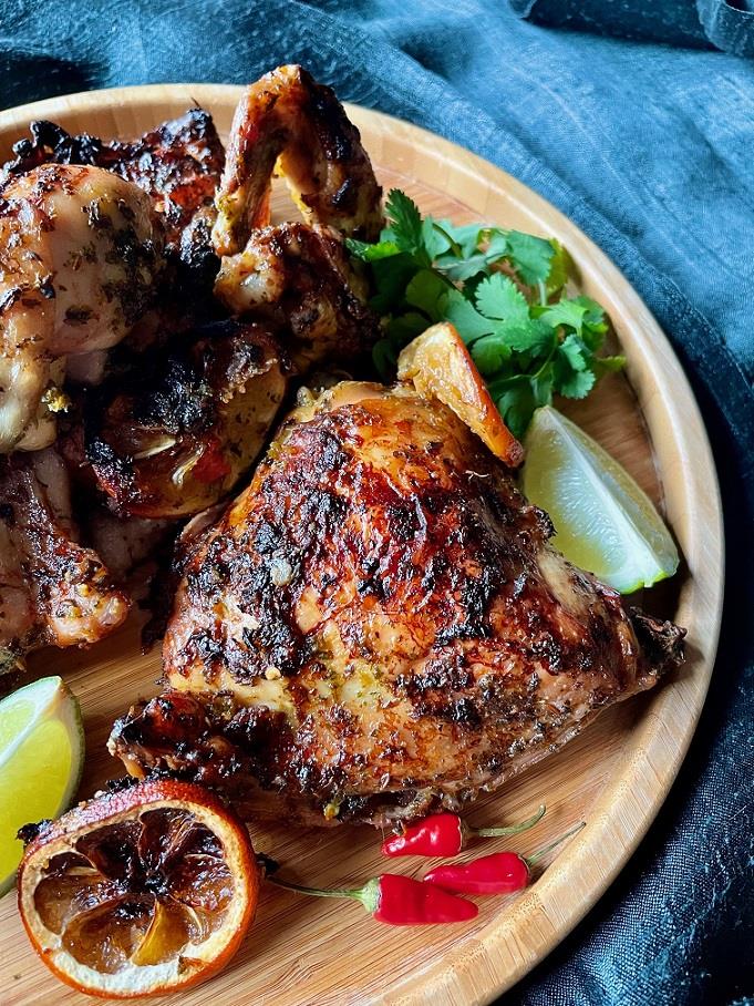Μαρινάρισμα : Βάζουμε την μαρινάδα σε μεγάλο μπολ, προσθέτουμε 1 κοτόπουλο κομμένο σε μερίδες με την πέτσα και τα κόκαλα και ανακατεύουμε καλά για να πάει η μαρινάδα παντού. Σκεπάζουμε με διαφανή μεμβράνη και βάζουμε στο ψυγείο για λίγες ώρες, ακόμη καλύτερα για όλη τη νύχτα. Κατά διαστήματα γυρίζουμε τα κομμάτια του κοτόπουλου για να ποτιστούν καλά από τη μαρινάδα από όλες τις πλευρές. Εναλλακτικά βάζουμε τη μαρινάδα σε σακούλα τροφίμων, προσθέτουμε τα κομμάτια του κοτόπουλου, ανακατεύουμε καλά, κλείνουμε τη σακούλα και βάζουμε στο ψυγείο.