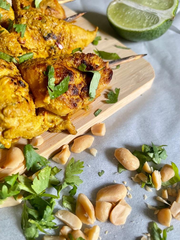 Σερβίρουμε τα σουβλάκια αφού τα πασπαλίσουμε με ψιλοκομμένο φρέσκο κόλιανδρο, τη σάλτσα satay, έξτρα lime για όποιον θελήσει και συνοδεύουμε με τη σαλάτα. Μπορούμε να συνοδεύσουμε και με ρύζι ατμού.