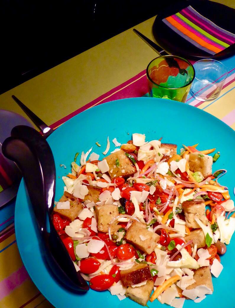 Πρώτον φροντίζουμε να έχουμε πολύ καλό ζυμωτό χωριάτικο ψωμί. Κόβουμε χοντρές φέτες, τις τρίβουμε με σκόρδο, τις αλείφουμε με ελαιόλαδο, αλατοπιπερώνουμε και ψήνουμε στον φούρνο στους 150 βαθμούς για 7-10’. Το ζητούμενο δεν είναι να κάνουμε παξιμάδια, αλλά η μεν κόρα να πάρει χρώμα και να είναι τραγανή, η δε ψίχα να μείνει σχετικά μαλακή για να απορροφήσει όλους τους χυμούς της καλοκαιρινής ντομάτας. Αφού βγάλουμε το ψωμί από τον φούρνο, ανεβάζουμε τους βαθμούς στους 180 και ψήνουμε ολόκληρα ντοματίνια (εάν μάλιστα βρούμε και πολύχρωμα, ακόμη καλύτερα) περιχυμένα με λίγο ελαιόλαδο και ελάχιστες σταγόνες καλής ποιότητας balsamico. Ψήνουμε έως ότου αρχίσει να σκάει η φλούδα τους. Μαζί με τα ντοματίνια ψήνουμε και 1-2 σκ. σκόρδου με την φλούδα τους. Παράλληλα κόβουμε κρεμμύδια σε πολύ λεπτές ροδέλες και τις βαπτίζουμε σε μπόλικο κρύο νερό για να φύγει η πολλή κάψα. Ετοιμάζουμε την sauce : χτυπάμε έξτρα παρθένο ελαιόλαδο με καλής ποιότητας ξύδι από κόκκινο κρασί (σε αναλογία 3:1) και προσθέτουμε τις ψητές σκελίδες σκόρδου, αφού βγάλουμε τη σάρκα και την λιώσουμε με το πηρούνι,, αλατοπίπερο, ξύσμα λεμονιού και ξαρμυρισμένη κάππαρη. Κόβουμε φινόκιο σε πολύ λεπτές φετούλες, κόκκινες και κίτρινες πιπεριές σε λεπτές λωρίδες και αγγούρι σε λεπτές λωρίδες επίσης. Αποφεύγουμε τις πράσινες πιπεριές γιατί το επιθετικό τους άρωμα αλλοιώνει εντελώς τη γεύση της σαλάτας. Σερβίρουμε σε μπωλ ανακατεύοντας τα ψητά ντοματίνια, προσθέτουμε και μερικά ωμά κομμένα στη μέση, καθώς και λίγες μαύρες ελιές (η δική μου αδυναμία είναι οι θρούμπες με την πικρή τους γεύση), τις φέτες του ψωμιού (κομμένες στα τέσσερα εάν είναι μεγάλες), το κρεμμύδι, τις πιπεριές, το φινόκιο και το αγγούρι, περιχύνουμε με τη sauce και ανακατεύουμε απαλά αλλά επισταμένως και τελειώνουμε με μυρωδάτο βασιλικό και λίγες φλοίδες παρμεζάνας.