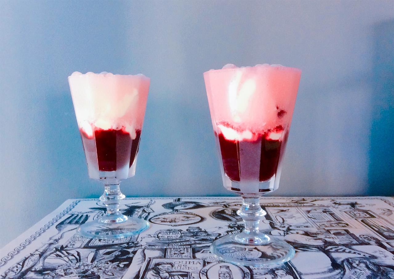 Σιρόπι : Σε κατσαρολάκι, φέρνουμε σε βρασμό σε δυνατή σχετικά φωτιά, 1 φλ. τσ. ζάχαρη και ¾ φλ. τσ. νερό. Βράζουμε για 8’ έως ότου το σιρόπι πήξει ελαφρά, έχοντας υπόψη ότι όσο κρυώνει θα πήζει κι άλλο. Αποσύρουμε από την εστία και προσθέτουμε 3 κ.σ. ροδόνερο και λίγες σταγόνες κόκκινο χρώμα ζαχαροπλαστικής. Ανακατεύουμε καλά και αφήνουμε να κρυώσει. Το σιρόπι διατηρείται σε βάζο στο ψυγείο.