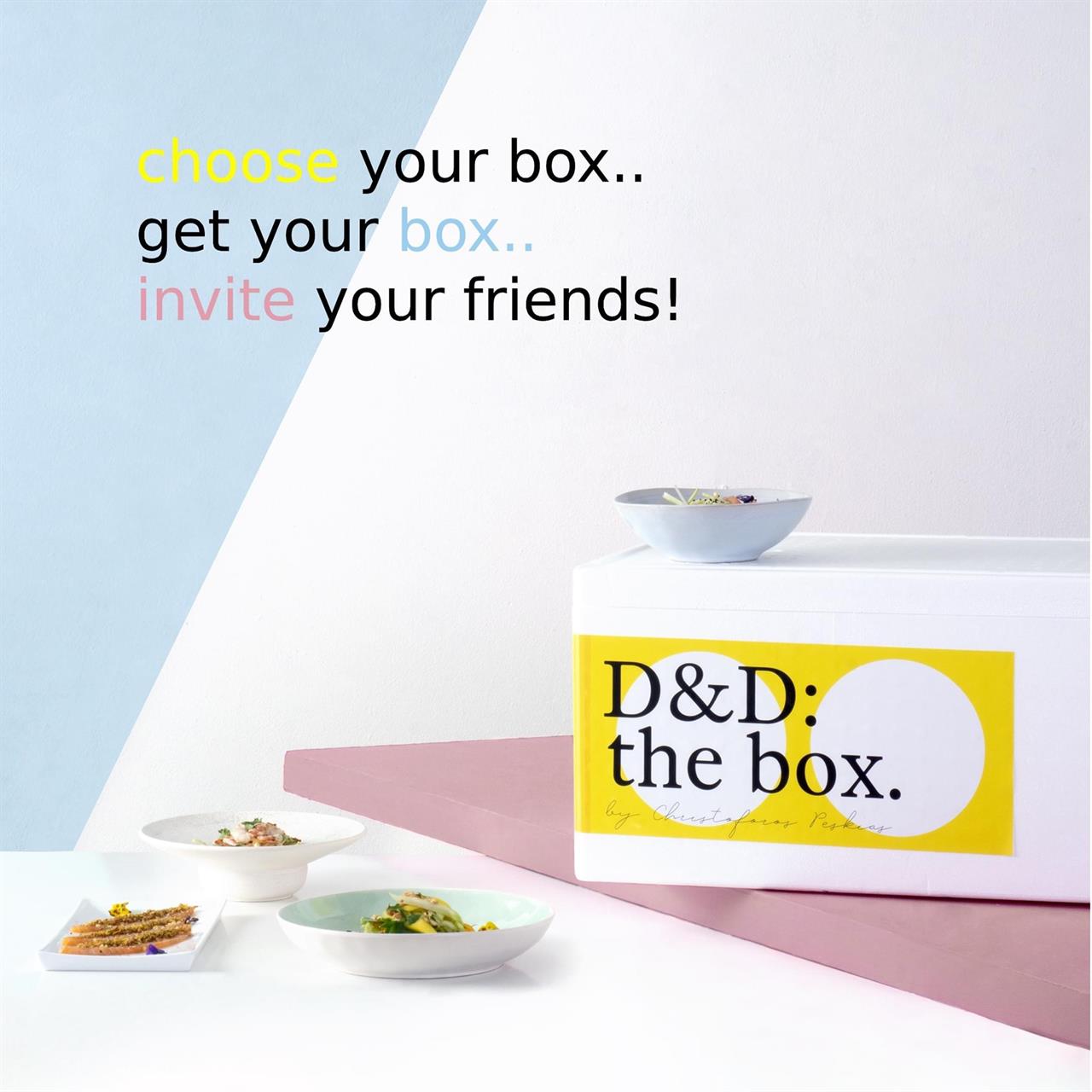 Πώς λειτουργεί;  Τα βήματα είναι πολύ απλά.  Καλείτε τους φίλους σας, επιλέγετε το μενού και περιμένετε το κουτί (το παραλαμβάνετε ή το στέλνουν στην πόρτα σας).  Το ανοίγετε και μέσα είναι τακτοποιημένα σε διαφορετικά πακέτα και με διαφορετικά χρώματα τα φαγητά που έχετε επιλέξει, μαζί και οι οδηγίες σερβιρίσματος και μία φωτογραφία του τελικού πιάτου.  Το μόνο που μένει να κάνετε είναι να συνδυάσετε τα υλικά και να σερβίρετε.  Το D&D The Box είναι ευέλικτο, δίνοντας κι άλλες επιλογές, όπως να μην επιλέξετε ένα ολοκληρωμένο μενού, αλλά να φτιάξετε εσείς το γλυκό ή τα ορεκτικά ή τη σαλάτα ή το κύριο πιάτο, ή κάποιο/α από όλα, όπως επίσης να σας φέρουν και τα σερβίτσια.