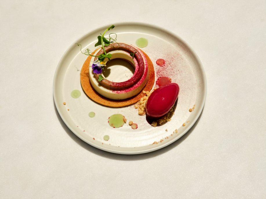 Στα επιδόρπια, η ανάλαφρη πανακότα παίρνει απίθανη δροσιά και τροπικό άρωμα από τα φρούτα του πάθους και το μάνγκο. Κι αν το cheesecake θεωρητικά είναι ένα πληθωρικό γλυκό που ταιριάζει πιο πολύ στο απόγευμα, εδώ είναι εξαιρετικά ελαφρύ με τέλεια ισορροπία μεταξύ του τραγανού σαμπλέ φουντουκιού, του βελούδου του κρεμέ της φράουλας και της δροσιάς από το gel βασιλικού και από το πολύ ιδιαίτερο σορμπέ από παντζάρι.