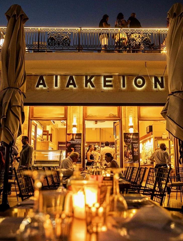Στην παραλία βρίσκεται και το περίφημο Αιάκειον, το αρχοντικό ζαχαροπλαστείο-καφέ της Αίγινας που σήμερα, μετά από εξήντα χρόνια, εξακολουθεί να δημιουργεί και να εξελίσσεται χάρη στην τρίτη γενιά των ιδιοκτητών, τους Μιχάλη Γαλάνη και Αλέξανδρο Κουκούλη, οι οποίοι με οδηγό και έμπνευση τα ντόπια προϊόντα και αδιαμφισβήτητο αρχηγό το φιστίκι, παράγουν μια σειρά από εξαιρετικής ποιότητας αλείμματα, μπάρες και κουλουράκια, φλωρεντίνες και παστέλια, μαρμελάδες και γλυκά του κουταλιού κι άλλα πολλά. Έχοντας μεγάλη αγάπη για τα υφάλμυρα γλυκά, δοκίμασα τρία από αυτά : τις τραγανές φλωρεντίνες με φιστίκι, το φιστικάτο, μια μπουκιά με πάστα αμυγδάλου στο εσωτερικό βουτηγμένη σε αλμυρή καραμέλα γάλακτος και καλυμμένη με ελαφρώς καβουρδισμένα φιστίκια και το απίθανο παγωτό φιστίκι με ντόπιο γάλα. Βαθμός απόλαυσης 10, αριθμός θερμίδων άπειρος, αλλά χαλάλι τους!