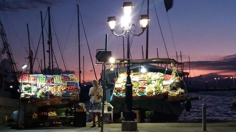 Απέναντι ακριβώς από τον Σκοτάδη είναι και τα δύο καΐκια, πλωτά μανάβικα, τα δύο που απέμειναν από τα 12 που υπήρχαν το 1942, όταν ταξίδευαν καθημερινά στην Πελοπόννησο και στον Πειραιά για να προμηθεύσουν το νησί με φρούτα και ζαρζαβατικά. Αν και σήμερα δεν ταξιδεύουν πια, αφού τα προϊόντα φτάνουν με τα καράβια της γραμμής, η παρουσία τους είναι συνυφασμένη με την Αίγινα. Είχα διαβάσει πως κινδύνευσαν να χάσουν την άδεια λειτουργίας τους πριν λίγα χρόνια, αλλά ευτυχώς αυτό απετράπη και σήμερα είναι εκεί, από το πρωί μέχρι πολύ αργά το βράδυ, μετά τα μεσάνυχτα.