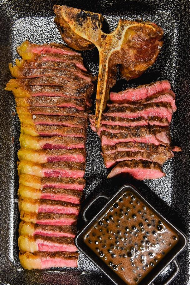 Βεβαίως, σε ένα εστιατόριο με το συγκεκριμένο όνομα και σκηνικό, η κρεοφαγία έχει τον πρώτο, σχεδόν αποκλειστικό, λόγο. Η κάρτα, σε σύλληψη, σχεδίαση και επιμέλεια του Μιχάλη Νουρνόγλου και εκτέλεση -άκρως επιτυχημένη- του Στέφανου Ρίζου, παίζει σε πολλά ταμπλό. Με πλούσια επιλογή από ορεκτικά (από € 9 έως € 29) τα οποία, όμως, μπορούν κάλλιστα να παίξουν τον ρόλο του κυρίως στη λογική του δοκιμάζουμε πολλούς διαφορετικούς συνδυασμούς κρέατος, όπως : Μοσχάρι σε raw εκδοχές (ταρτάρ που παιχνιδίζει στη γλώσσα με λάδι λεμονιού και χρένο ή λουσάτο καρπάτσιο από Wagyu με λάδι φουντουκιού, έξτρα παλαιωμένο original και γνήσιο Gouda και πιπέρι Τασμανίας), μοσχαρίσια αργομαγειρεμένη στηθοπλευρά με εξαιρετικά χειροποίητα λαζάνια και σάλτσα ολλαντέζ, μια πολύ ιδιαίτερη πίτα του βοσκού -φερμένη σε αστικό περιβάλλον- με μοσχαρίσια ουρά, μανιτάρια και μπεσαμέλ με ένα από τα νοστιμότερα γαλλικά τυριά, το Comté, κάτι μικρούλικα burgers με dry aged μοσχαρίσιο κιμά, καταπληκτικό βρετανικό Red Leicester Cheddar και πολλά άλλα πιάτα που ανοίγουν την όρεξη (λουκάνικα, καπνιστή πανσέτα, μεδούλι).