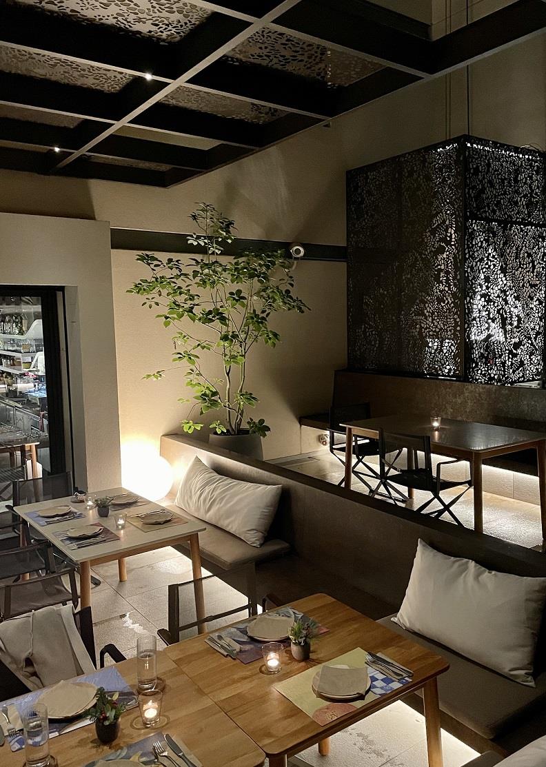 Το απόγευμα της Παρασκευής της πρόσκλησης ήταν βροχερό, τέλειος καιρός για να χωθείς στην αγκαλιά ενός μουσείου και να περάσεις λίγες ώρες μακριά από όλα. Αφού πήρα μέσα μου όση ομορφιά χώρεσε από τα έργα κι αφού ψώνισα υπέροχα χριστουγεννιάτικα στολίδια από την εξίσου εμπνευσμένη μπουτίκ του μουσείου, ανέβηκα στον ημιώροφο όπου βρίσκεται το καφέ. Εκεί με περίμενε μια άλλη έκπληξη. Διασχίζοντας τον εσωτερικό χώρο βρέθηκα σε μία όαση, γιατί ως τέτοια μπορώ να χαρακτηρίσω το σκεπαστό αίθριο όπου ήταν στρωμένα τα τραπέζια για το δείπνο που θα ακολουθούσε. Λιτό κι απέριττο, αυλή και κήπος μαζί, ατμοσφαιρικά φωτισμένο. Με μια λέξη, πανέμορφο.