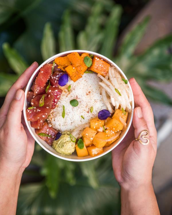 Μιλώντας για εποχιακά υλικά, άλλη μία από τις πολλές μου εμμονές, δεν μπορώ παρά να χειροκροτήσω τον συνδυασμό της burrata με κολοκύθα, αχλάδι, φουντούκια, πορτοκάλια, ρόκα και χαρουπόψωμο. Στο ίδιο φθινοπωρινό μοτίβο παίζει και το poké bowl, ένα ελαφρύ πιάτο που έρχεται από την Χαβάη και που στην αρχική του μορφή ήταν το σνακ των ψαράδων του νησιού με ό,τι ψάρι είχαν πιάσει κομμένο σε κύβους (ωμό, βεβαίως), μαριναρισμένο σε θαλασσινό αλάτι, φύκια κι άλλα τοπικά υλικά, ό,τι λαχανικό είχαν πρόχειρο και ρύζι στον ατμό. Από την Χαβάη το poké bowl έχει φτάσει παντού και αποτελεί ένα υγιεινό πλήρες γεύμα. Στην εκδοχή του ΙΤ το ψάρι είναι τόνος και συνοδεύεται από χιονάτο jasmine rice, λωτό, κολοκύθα, σελινόριζα και hummus αρακά.