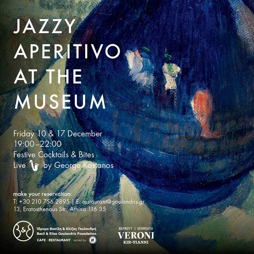 Μόλις πριν 2-3 μέρες έλαβα και μία πολύ ευχάριστη είδηση, πως τις ερχόμενες δύο Παρασκευές πριν από τα Χριστούγεννα, δηλ. στις 10 και στις 17 Δεκεμβρίου, το καφέ/εστιατόριο του Μουσείου θα γίνει ακόμα πιο γιορτινό, αφού θα παραμείνει ανοιχτό έως τις 10 το βράδυ με live jazz μουσική, cocktails με το εξαιρετικό Veroni Vermouth του Κυρ-Γιάννη φτιαγμένα από τον αγαπητό άξιο bartender Παναγιώτη Φράγκο και, βεβαίως, ένα ειδικό για την περίσταση finger food menu από τον σεφ του ΙΤ, Δημήτρη Δαγκλή. Πόσο όμορφη ιδέα!