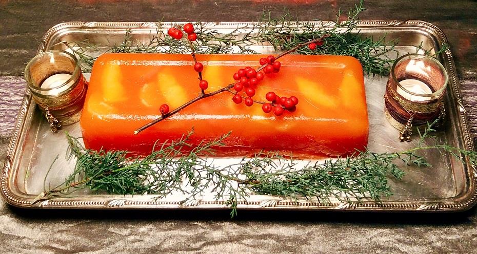 Για 10 άτομα. Βάζουμε 6 φύλλα ζελατίνας σε ένα μπολ με κρύο νερό και παγάκια και τα αφήνουμε να μαλακώσουν καλά. Στύβουμε 6 μεγάλα πορτοκάλια. Ζεσταίνουμε 100 ml από τον χυμό πορτοκαλιού που στύψαμε και ακριβώς προτού πάρει βράση, αποσύρουμε από τη φωτιά και προσθέτουμε τα φύλλα της ζελατίνας, αφού τα στύψουμε καλά. Ανακατεύουμε με επιμέλεια για να διαλυθεί εντελώς η ζελατίνα, προσθέτουμε τον υπόλοιπο χυμό πορτοκαλιού και 100 ml Campari και ανακατεύουμε καλά. Στρώνουμε με διαφανή μεμβράνη τον πάτο και τα τοιχώματα μιας μακρόστενης φόρμας του cake μήκους περίπου 26 εκ. και αφήνουμε αρκετή μεμβράνη να περισσεύει για να κλείσουμε στο τέλος το γλυκό. Βάζουμε στη φόρμα λίγο από το υγρό (σε ύψος περίπου 2 εκ.) και παγώνουμε στο ψυγείο, μέχρι να αρχίσει το ζελέ να στερεοποιείται. Στο μεταξύ προετοιμάζουμε τα φρούτα : καθαρίζουμε και χωρίζουμε σε φέτες 4 κλεμεντίνες και φιλετάρουμε 2 πορτοκάλια και 3 grapefruits (βλ. tips). Μόλις σταθεροποιηθεί η πρώτη στρώση του ζελέ, γεμίζουμε όλη την επιφάνεια με φρούτα, σκεπάζουμε με λίγο ακόμη χυμό πορτοκαλιού και ξαναβάζουμε στο ψυγείο μέχρι να σταθεροποιηθεί και αυτή η στρώση. Επαναλαμβάνουμε με τον ίδιο τρόπο κάθε στάδιο, μέχρι να τελειώσει ο χυμός και τα φρούτα. Σκεπάζουμε με την μεμβράνη που περισσεύει και παγώνουμε στο ψυγείο για 12 ώρες. Για να σερβίρουμε, ανοίγουμε την μεμβράνη, αναποδογυρίζουμε σε πιατέλα και αφαιρούμε προσεκτικά την μεμβράνη από τα πλάγια και το πάνω μέρος.