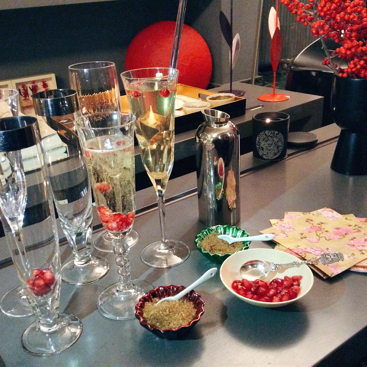 Στον πάτο κάθε ποτηριού βάζουμε ελάχιστη, στη μύτη ενός μικρού κουταλιού, καστανή ζάχαρη και λίγες σταγόνες ροδόνερου, όχι παραπάνω από 1 κουταλάκι του espresso. Ανακατεύουμε με ένα μακρύ κουτάλι για να αρχίσει να διαλύεται η ζάχαρη και προσθέτουμε λίγα σπόρια ροδιού. Γεμίζουμε τα ποτήρια με προσοχή με το αφρώδες παγωμένο κρασί, τσουγκρίζουμε και απολαμβάνουμε.