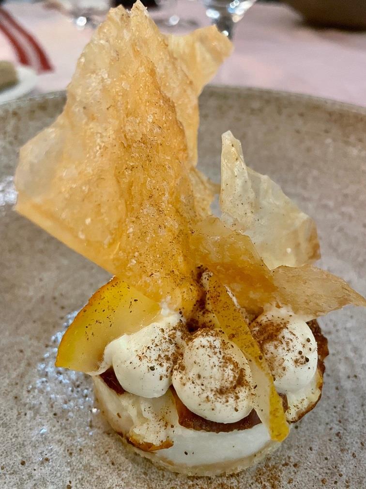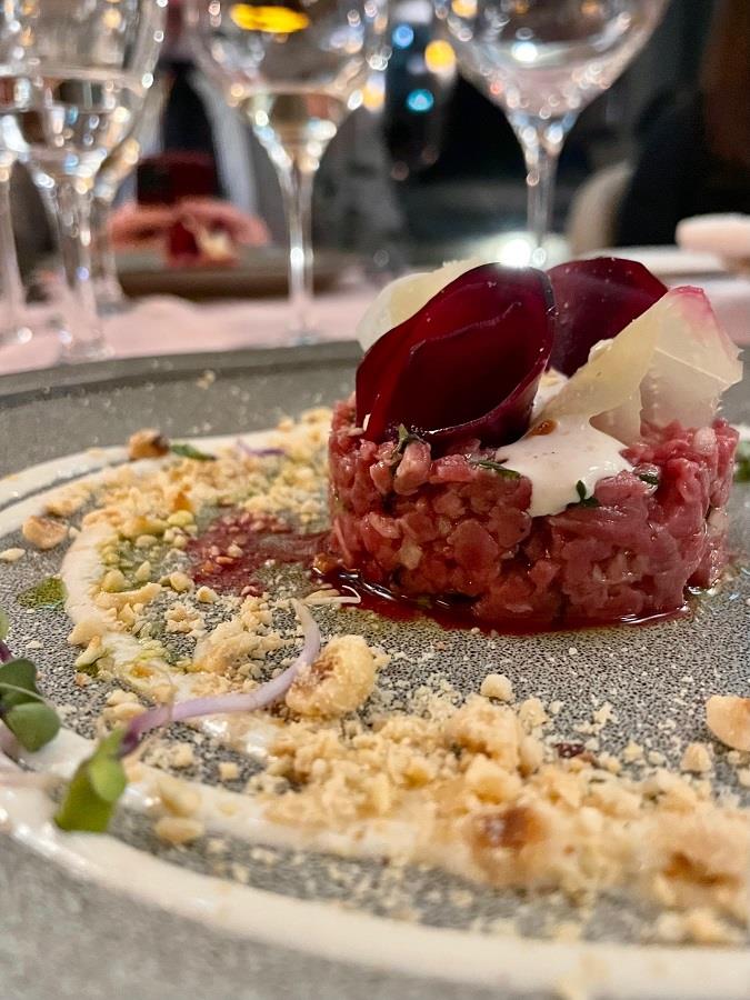 Έτσι, επέλεξε να αφήσει ατόφιο το μοσχαράκι και να το σερβίρει σαν ταρτάρ με κρέμα φουντουκιού, καπνιστό μετσοβίτικο τυρί και πίκλες παντζαριού, να φτιάξει τη σούπα μανιταριών σαν καπουτσίνο με αφρόγαλα από κατσικίσιο τυρί, να πανάρει το τέλειο μελάτο  αυγό και να το συνοδεύσει με σπανάκι και σάλτσα με ντόπια γραβιέρα και φρέσκια τρούφα, να συνδυάσει πανέξυπνα το καπνιστό χέλι με φάβα, ψητό αχλάδι και pesto χορταρικών, να τονίσει τη νοστιμιά των χειροποίητων νιόκι πατάτας με άγρια μανιτάρια Πίνδου και κρέμα από παλαιωμένη γραβιέρα, να μαγειρέψει το αγριογούρουνο σε κόκκινο μετσοβίτικο κρασί και να το παντρέψει με πουρέ από κάστανα και κρεμμυδάκια του στιφάδου και να μας γλυκάνει με πολίτικο χαλβά, αριστοτεχνικά ταιριασμένο με μαρμελάδα λεμόνι, σοκολάτα και πραλίνα φιστικιού και μπακλαβά-millefeuille αρωματισμένο με μπαχαρικά, σάλτσα από ρόδι και δροσισμένο από φρέσκα ξινούτσικα κόκκινα φρούτα του δάσους.
