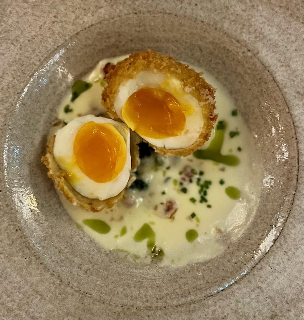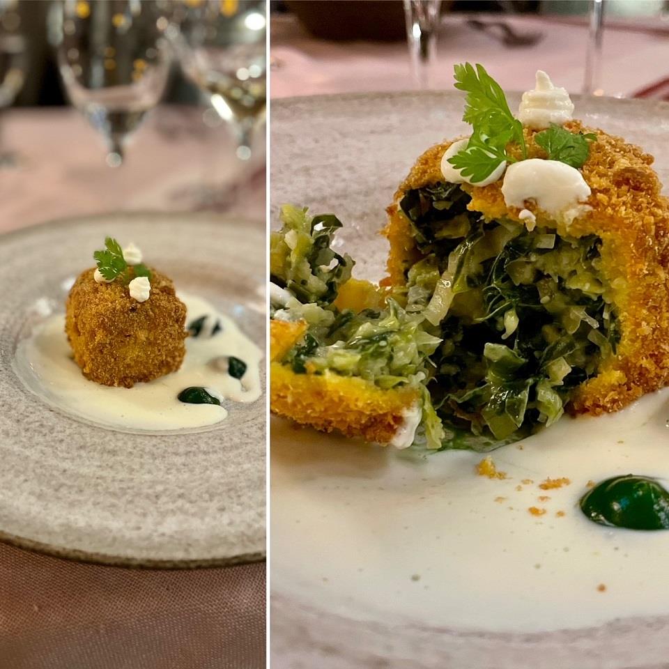 Ο νεαρός σεφ Βασίλης Γιαννούλης, όχι μόνον εκτελεί άψογα το μενού του Γκίκα Ξενάκη, αλλά δείχνει και το ταλέντο του με τη σύγχρονη εκδοχή της πισπιλίτας, όπως ονομάζεται η χορτόπιτα της περιοχής. Τα άγρια χόρτα κλείστηκαν σε κρούστα από καλαμποκάλευρο και το τυρί έγινε βελούδινη κρέμα.