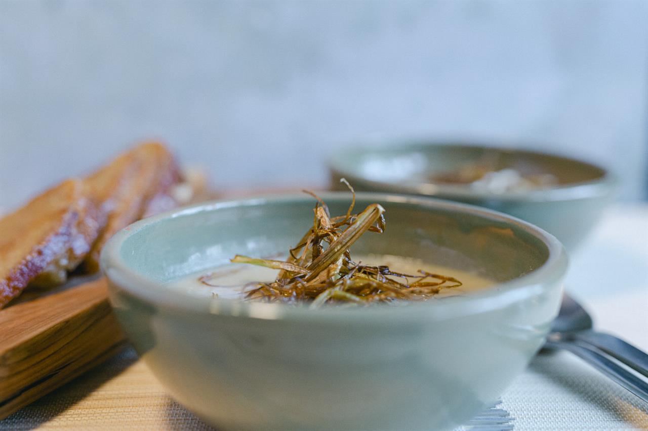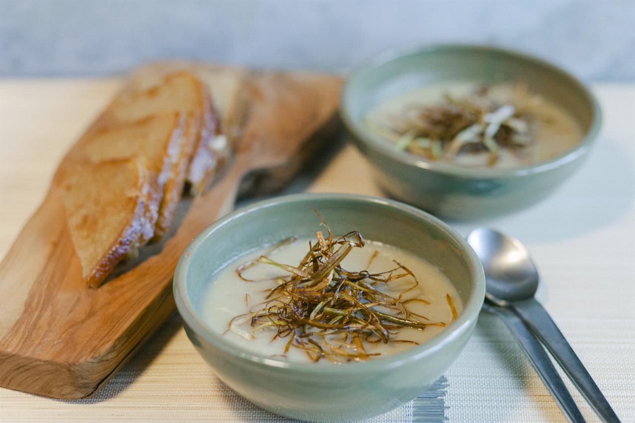 Όση ώρα βράζει η σούπα, ετοιμάζουμε τα τηγανιτά πράσα. Κόβουμε το τέταρτο πράσο σε τρία μπαστούνια και κάθε μπαστούνι σε πολύ λεπτές λωρίδες. Ζεσταίνουμε καλά μία μικρή κατσαρόλα, προσθέτουμε ελαιόλαδο, τόσο ώστε να κολυμπάνε τα πράσα μέσα (deep fry) και τα τηγανίζουμε ανακατεύοντας συνεχώς με τρυπητή κουτάλα για να μην καούν (το να "αρπάξουν" λίγο είναι καλοδεχούμενο γιατί εντείνεται η γεύση, όχι όμως να καούν γιατί θα πικρίσουν άσχημα) . Τα βγάζουμε με την τρυπητή κουτάλα και τα τοποθετούμε σε απορροφητικό χαρτί μέχρι την ώρα που θα σερβίρουμε.