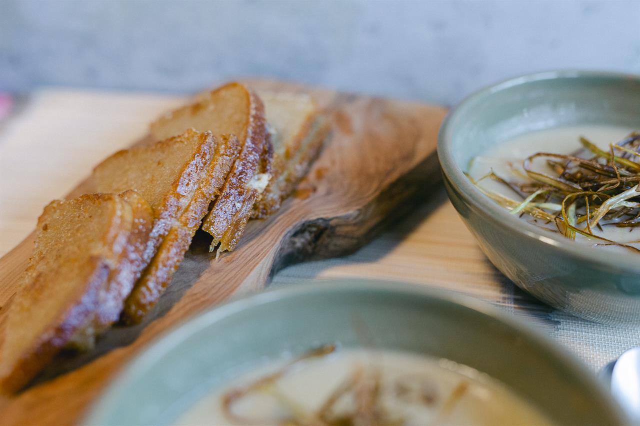 Συνοδεύουμε με τοστ που φτιάχνουμε στο τηγάνι ως εξής : Βουτυρώνουμε και τις δύο πλευρές κάθε φέτας ψωμιού, βάζουμε στη μέση φέτες από το ίδιο καπνιστό τυρί που χρησιμοποιήσαμε στη σούπα και τηγανίζουμε με λίγο βούτυρο. Το βουτύρωμα και της εξωτερικής πλευράς είναι αυτό που θα κάνει το τοστ τέλειο.