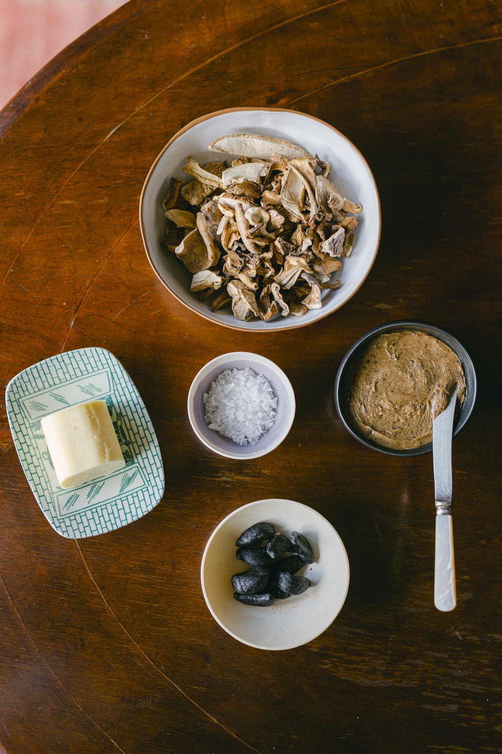 Αφήνουμε 250 γρ. αγελαδινό βούτυρο για αρκετές ώρες εκτός ψυγείου για να μαλακώσει και να γίνει σαν αλοιφή. Βάζουμε στο multi 10 γρ. αποξηραμένα μανιτάρια (porcini, shiitake ή άλλο είδος) και τα κάνουμε πούδρα. Ανακατεύουμε το βούτυρο με κόκκους άνθους αλατιού, την πούδρα των μανιταριών και 1 γεμάτο κ.γλ. πολτό μαύρου σκόρδου (ή 2 σκελίδες λιωμένες με πιρούνι) και σχηματίζουμε μπαστούνι το οποίο τυλίγουμε με μεμβράνη και βάζουμε στο ψυγείο. Αν πρόκειται να χρησιμοποιήσουμε το βούτυρο την ίδια ή την επόμενη μέρα, μπορούμε να το βάλουμε σε μπολ, να το σκεπάσουμε με μεμβράνη και να το αφήσουμε εκτός ψυγείου. Μπορούμε να χρησιμοποιήσουμε και αλατισμένο βούτυρο. Σε αυτήν την περίπτωση δεν προσθέτουμε άλλο αλάτι.