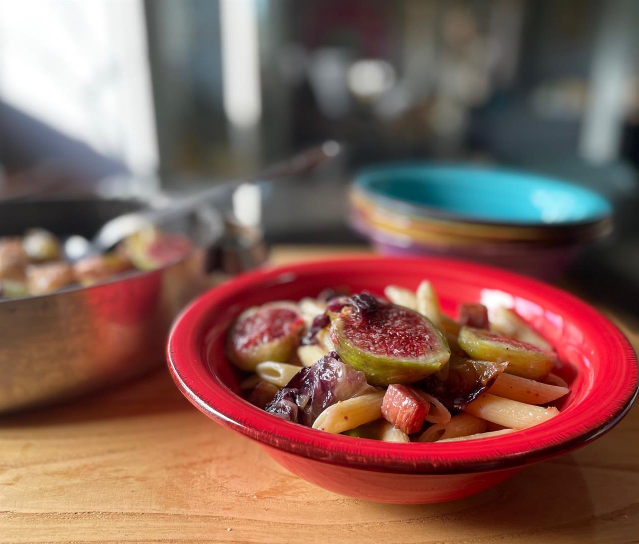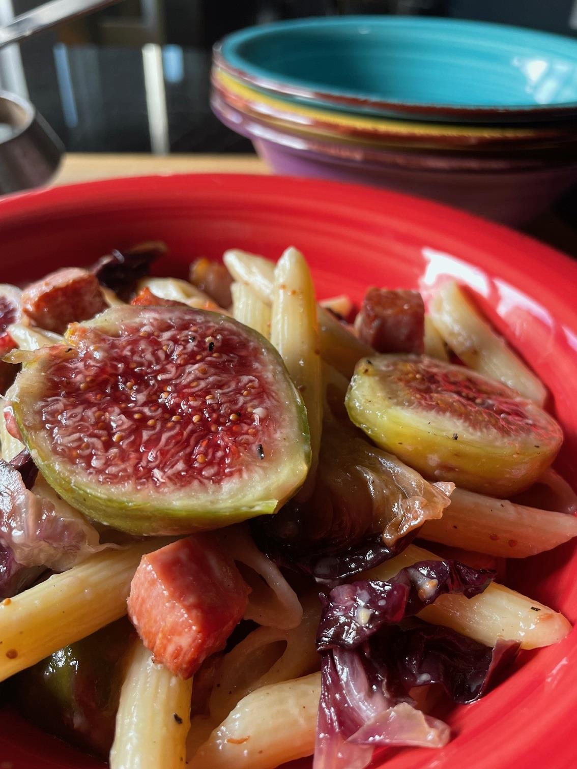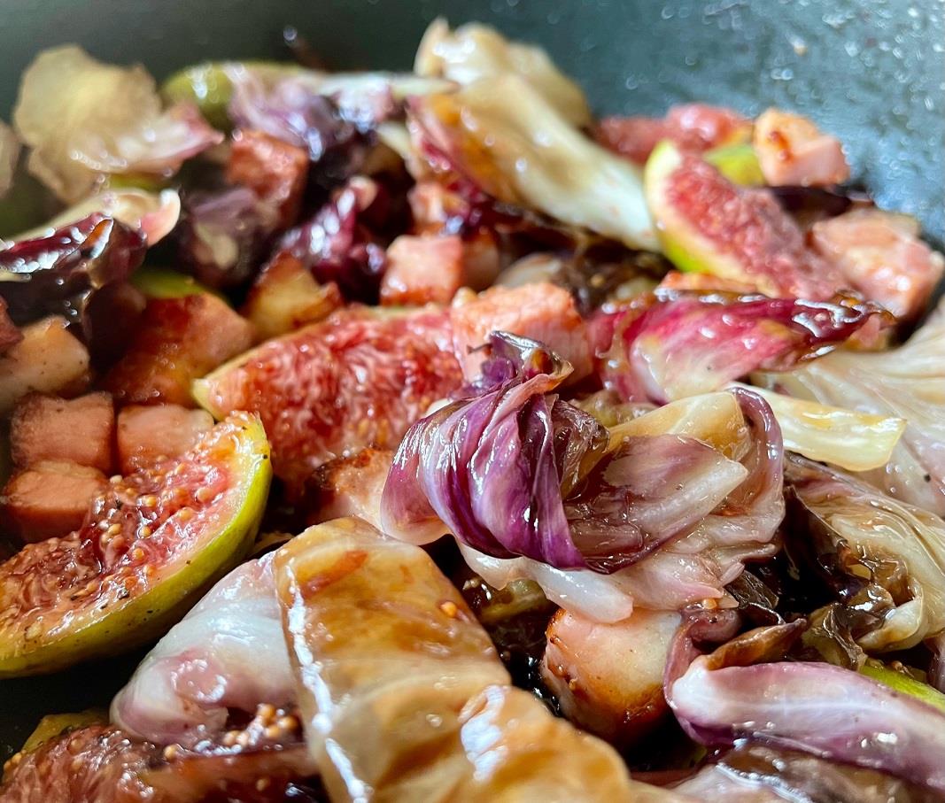 Σε ένα βαθύ τηγάνι που θα πρέπει στο τέλος να χωρέσει και τα ζυμαρικά, σοτάρουμε σε μέτρια προς δυνατή φωτιά 250 γρ. καπνιστή πανσέτα κομμένη σε κύβους, δίνοντάς τους χρώμα από όλες τις πλευρές. Στο τηγάνι έχουμε βάλει και δυο κλαράκια φρέσκο δενδρολίβανο. Αφαιρούμε τους κύβους του αλλαντικού με τρυπητή κουτάλα και στο λίπος που έχουν αφήσει στο σκεύος βάζουμε χοντροκομμένα φύλλα από ένα μικρό ραντίτσιο. Τα αλατίζουμε ελαφρά και τα σοτάρουμε για ελάχιστα λεπτά, μέχρι ίσα να μαραθούν : τα πιο λεπτά φύλλα θα μαραθούν τελείως, ενώ τα πιο χοντρά εσωτερικά θα μείνουν τραγανά. Αυτό είναι το ζητούμενο. Τα αφαιρούμε. Στο ίδιο σκεύος βάζουμε 8 σύκα πλυμένα με την φλούδα τους και κομμένα στα 4 και τα γυρνάμε για πολύ λίγο και πολύ απαλά για να μην διαλυθούν. Αφαιρούμε το δενδρολίβανο και επιστρέφουμε στο σκεύος το ραντίτσιο και την πανσέτα. Πιπερώνουμε γενναιόδωρα με φρεσκοτριμμένο μαύρο πιπέρι και αφήνουμε προς το παρόν στην άκρη.