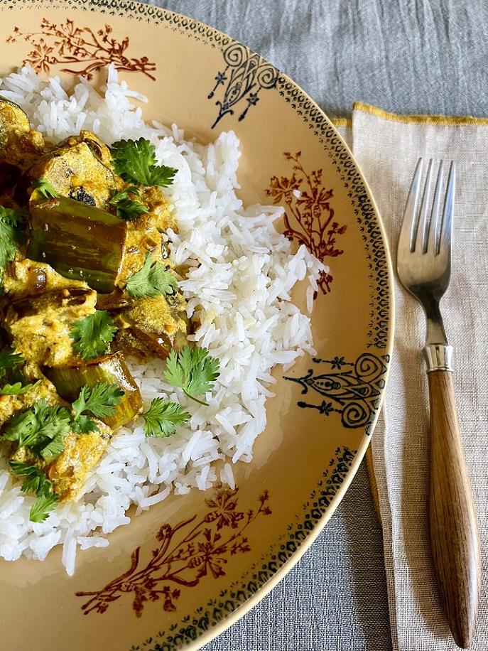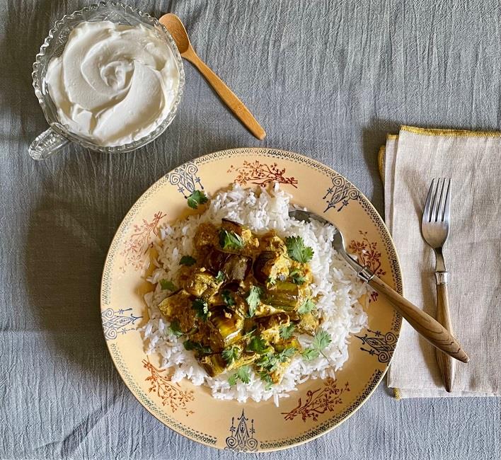 Σερβίρουμε σε βαθιά πιατέλα πάνω από λευκό ρύζι basmati και πασπαλίζουμε με μπόλικο φρέσκο κόλιανδρο (ή μαϊντανό, γνωρίζοντας πως το άρωμα θα είναι εντελώς διαφορετικό). Συνοδεύουμε με έξτρα γιαούρτι για τη δροσιά του.