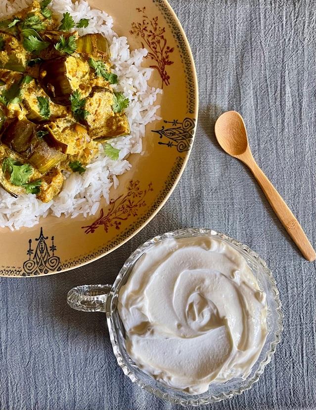 Σε μία κατσαρόλα σοτάρουμε σε μέτρια προς δυνατή φωτιά σε 4 κ.σ. coconut oil (βλ. tips) 1 μεγάλο κρεμμύδι ψιλοκομμένο, 1 κ.γλ. σιναπόσπορους, 1 κ.γλ. σκόνη ginger, 1 κ.γλ. σκόνη κόλιαντρο, 1 κ.γλ. σπόρους κύμινου (ή ½ κ.γλ. σκόνη), 1 κ.γλ. σκόνη κουρκουμά, ¼ κ.γλ. σκόνη γαρύφαλλο, 3 φύλλα κάρι (αν δεν έχετε, παραλείψτε τα) και ¼ κ.γλ. πιπέρι καγιέν (εγώ έβαλα τη διπλάσια ποσότητα γιατί μου αρέσει το καυτερό). Ανακατεύουμε συνεχώς και αν δούμε ότι στεγνώνει πολύ το μίγμα, προσθέτουμε σταδιακά ελάχιστο νερό για να μαλακώσει το κρεμμύδι χωρίς να καεί. Μόλις γίνει αυτό, προσθέτουμε 1 σκ. σκόρδου ψιλοτριμμένη ή λιωμένη με το ειδικό εργαλείο και σοτάρουμε για λίγα λεπτά ακόμη, μέχρι να μυρίσει το σκόρδο. Τότε, προσθέτουμε και τις μελιτζάνες και λίγο νερό και μαγειρεύουμε για λίγη ώρα μέχρι να μαλακώσουν οι μελιτζάνες, προσέχοντας να μην λιώσουν. Προσθέτουμε 1 κεσέ στραγγιστό γιαούρτι και ανακατεύουμε απαλά για να ενσωματωθεί στη σάλτσα χωρίς να λιώσουν οι μελιτζάνες.